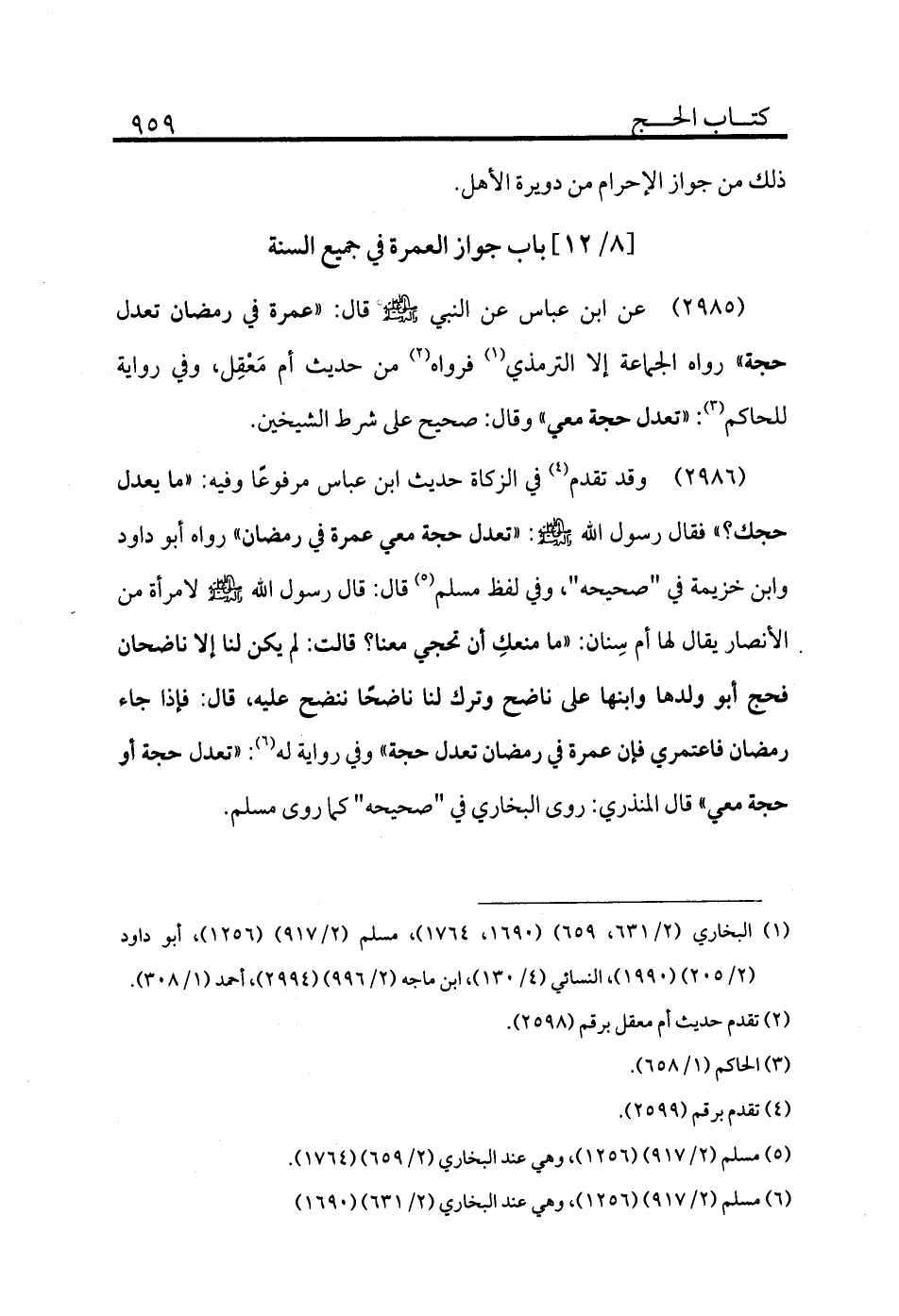 2985 - عن ابن عباس عن النبي - صلى الله عليه وسلم - قال: «عمرة في رمضان تعدل حجة» رواه الجماعة إلا الترمذي (¬1) فرواه (¬2) من حديث أم مَعْقِل، وفي رواية للحاكم (¬3) : «تعدل حجة معي» وقال: صحيح على شرط الشيخين.