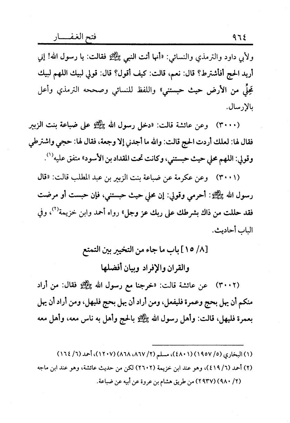 3001 - وعن عكرمة عن ضباعة بنت الزبير بن عبد المطلب قالت: «قال رسول الله - صلى الله عليه وسلم -: أحرمي وقولي: إن محلي حيث حبستني، فإن حبست أو مرضت فقد حللت من ذاك بشرطك على ربك عز وجل» رواه أحمد وابن خزيمة (¬2) وفي الباب أحاديث.