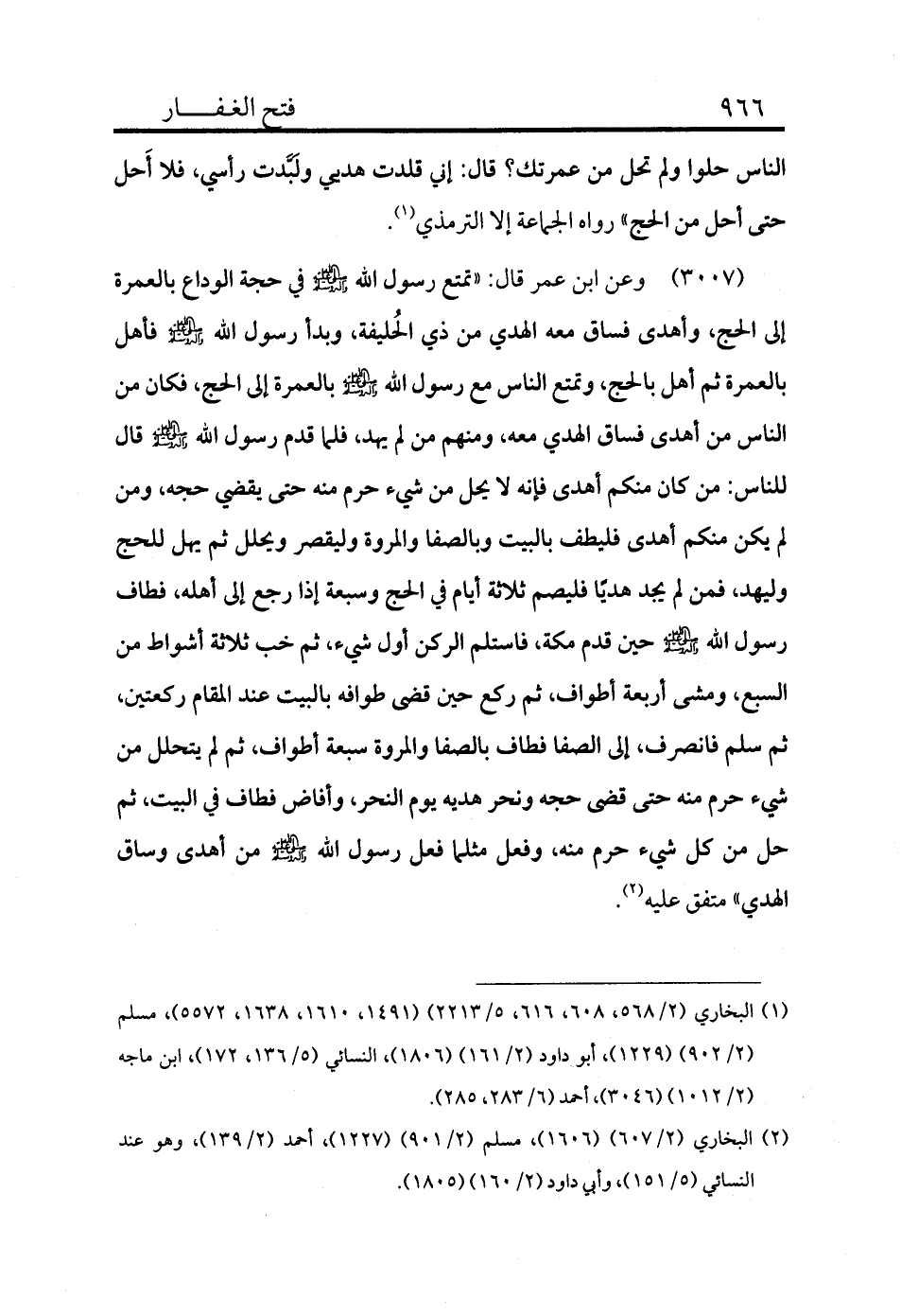 3007 - وعن ابن عمر قال: «تمتع رسول الله - صلى الله عليه وسلم - في حجة الوداع بالعمرة إلى الحج، وأهدى فساق معه الهدي من ذي الحُليفة، وبدأ رسول الله - صلى الله عليه وسلم - فأهل بالعمرة ثم أهل بالحج، وتمتع الناس مع رسول الله - صلى الله عليه وسلم - بالعمرة إلى الحج فكان من الناس من أهدى فساق الهدي معه ومنهم من لم يهد فلما قدم رسول الله - صلى الله عليه وسلم - قال للناس: من كان منكم أهدى فإنه لا يحل من شيء حرم منه حتى يقضي حجه ومن لم يكن منكم أهدى فليطف بالبيت وبالصفا والمروة وليقصر ويحلل ثم يهل للحج وليهد فمن لم يجد هديًا فليصم ثلاثة أيام في الحج وسبعة إذا رجع إلى أهله فطاف رسول الله - صلى الله عليه وسلم - حين قدم مكة فاستلم الركن أول شيء ثم خب ثلاثة أشواط من السبع، ومشى أربعة أطواف ثم ركع حين قضى طوافه بالبيت عند المقام ركعتين، ثم سلم فانصرف إلى الصفا فطاف بالصفا والمروة سبعة أطواف ثم لم يتحلل من شيء حرم منه حتى قضى حجه ونحر هديه يوم النحر وأفاض فطاف في البيت ثم حل من كل شيء حرم منه وفعل مثلما فعل رسول الله - صلى الله عليه وسلم - من أهدى وساق الهدي» متفق عليه (¬2) .