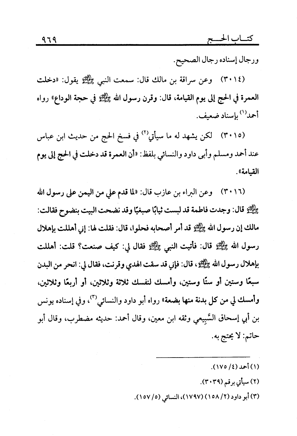 3014 - وعن سراقة بن مالك قال: سمعت النبي - صلى الله عليه وسلم - يقول: «دخلت العمرة في الحج إلى يوم القيامة، قال: وقرن رسول الله - صلى الله عليه وسلم - في حجة الوداع» رواه أحمد (¬1) بإسناد ضعيف.