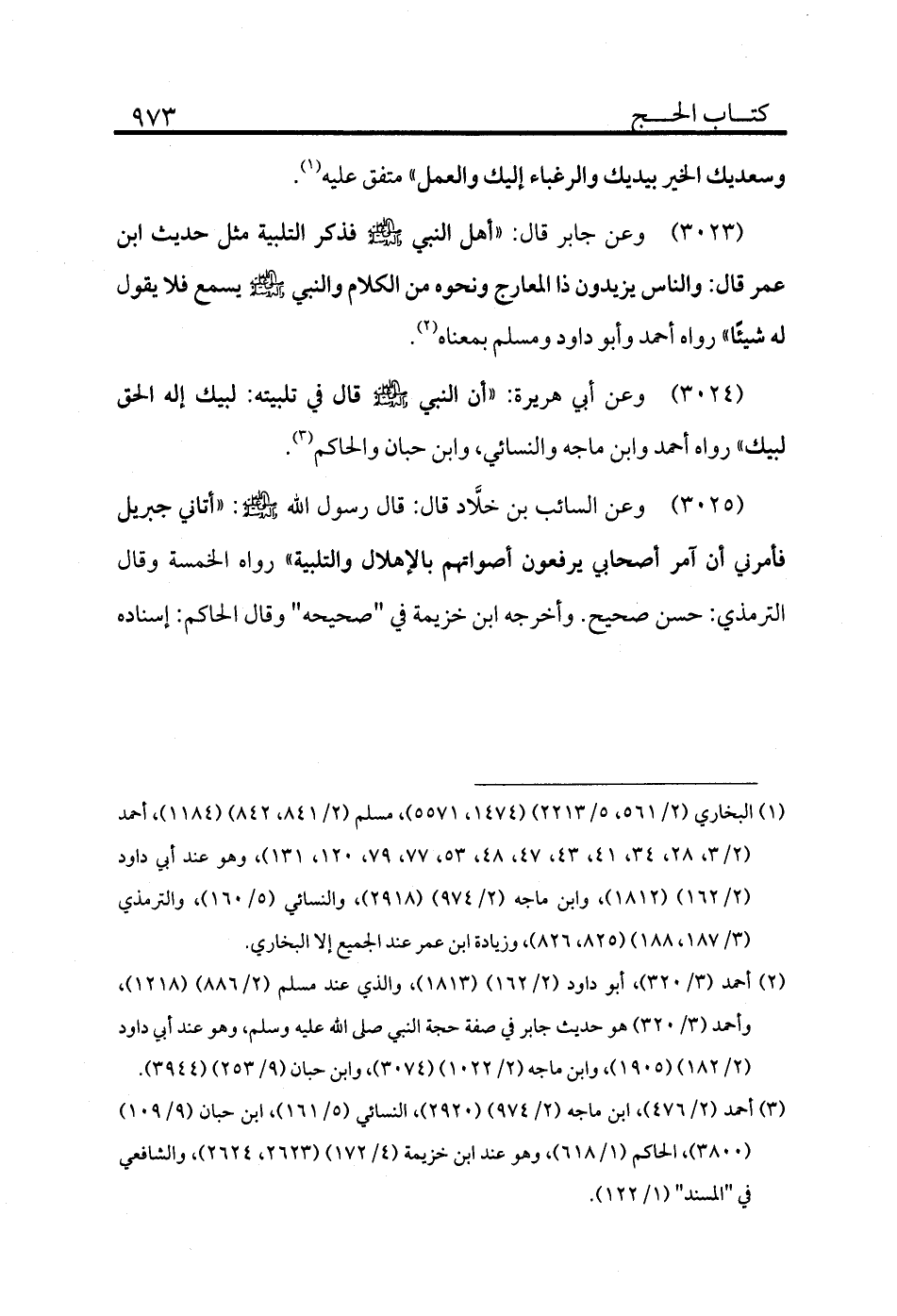 3024 - وعن أبي هريرة: «أن النبي - صلى الله عليه وسلم - قال في تلبيته: لبيك إله الحق لبيك» رواه أحمد وابن ماجه والنسائي، وابن حبان والحاكم (¬3) .