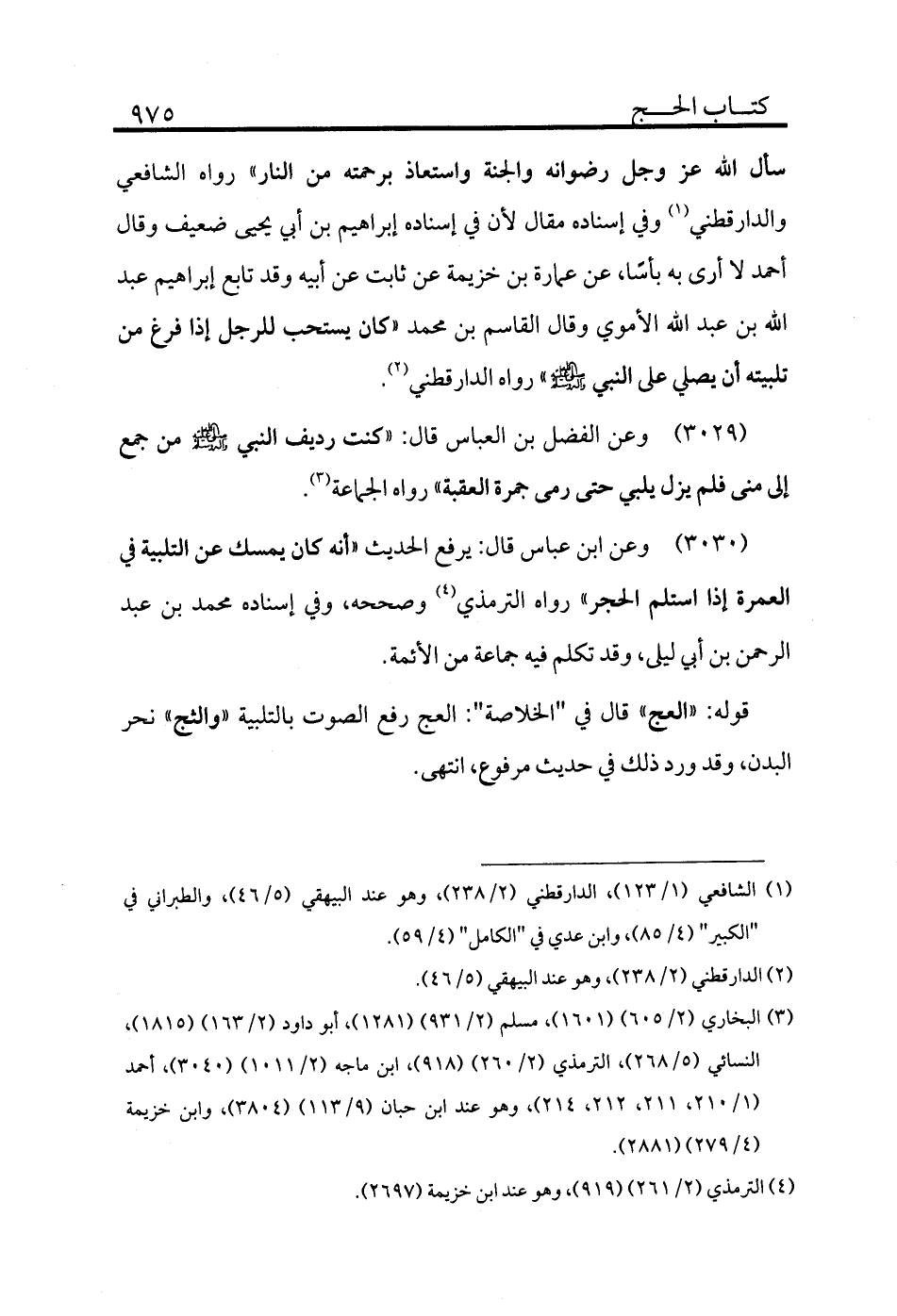 3030 - وعن ابن عباس قال: يرفع الحديث «أنه كان يمسك عن التلبية في العمرة إذا استلم الحجر» رواه الترمذي (¬4) وصححه، وفي إسناده محمد بن عبد الرحمن بن أبي ليلى، وقد تكلم فيه جماعة من الأئمة.