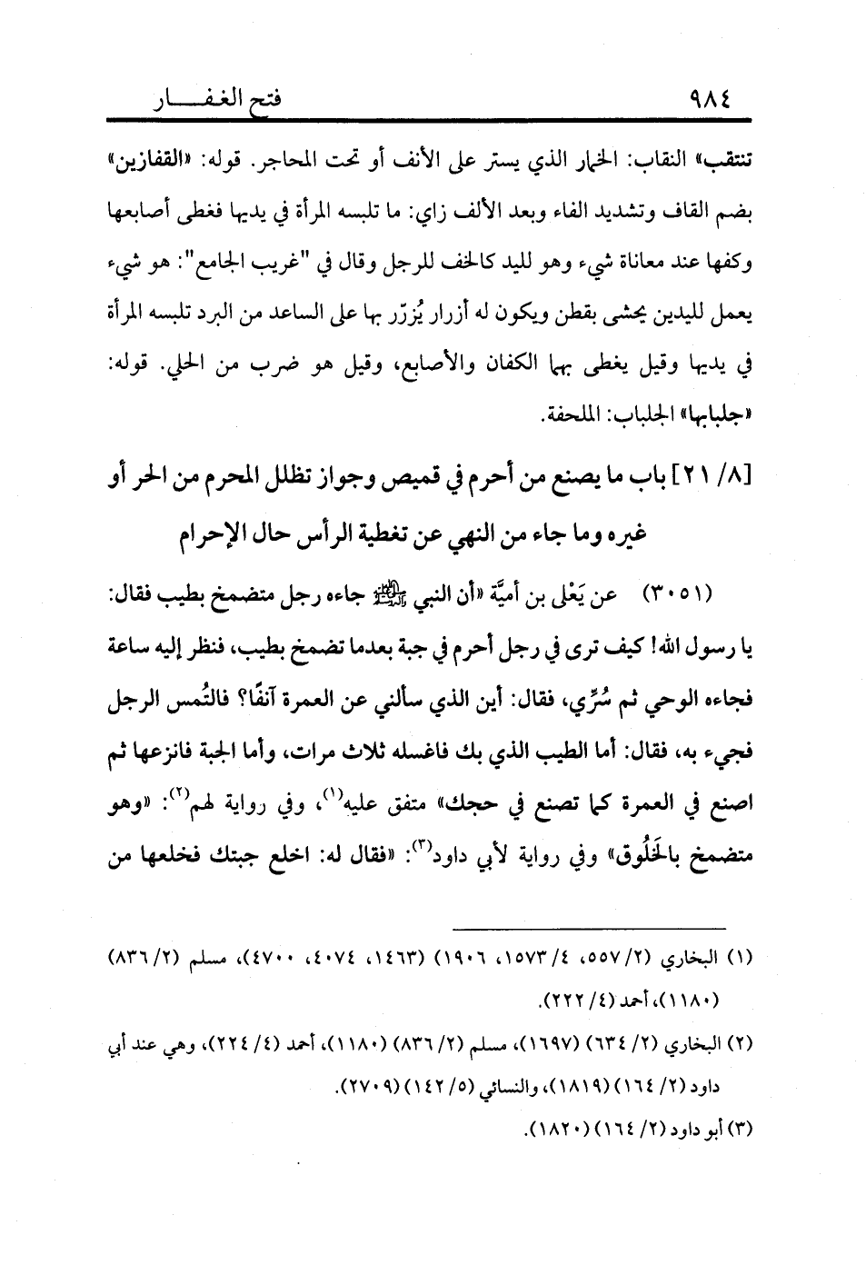 3051 - عن يَعْلى بن أميَّة «أن النبي - صلى الله عليه وسلم - جاءه رجل متضمخ بطيب فقال: يا رسول الله! كيف ترى في رجل أحرم في جبة بعدما تضمخ بطيب فنظر إليه ساعة فجاءه الوحي ثم سُرِّي فقال: أين الذي سألني عن العمرة آنفًا؟ فالتُمس الرجل فجيء به فقال: أما الطيب الذي بك فاغسله ثلاث مرات، وأما الجبة فانزعها ثم اصنع في العمرة كما تصنع في حجك» متفق عليه (¬1) ، وفي رواية لهم (¬2) : «وهو متضمخ بالخَلُوق» وفي رواية لأبي داود (¬3) : «فقال له: اخلع جبتك فخلعها من