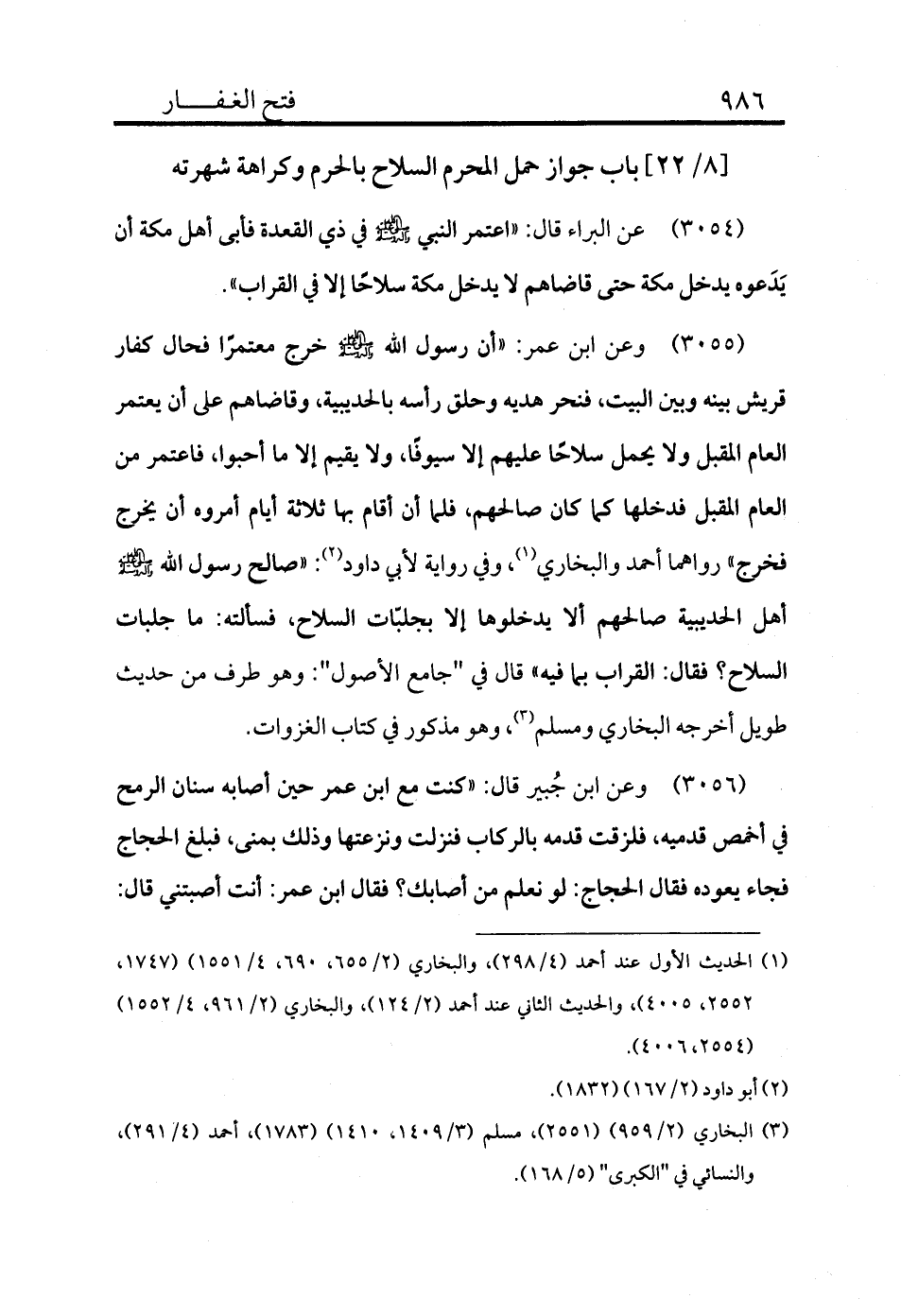 3054 - عن البراء قال: «اعتمر النبي - صلى الله عليه وسلم - في ذي القعدة فأبى أهل مكة أن يَدَعوه يدخل مكة حتى قاضاهم لا يدخل مكة سلاحًا إلا في القراب» .