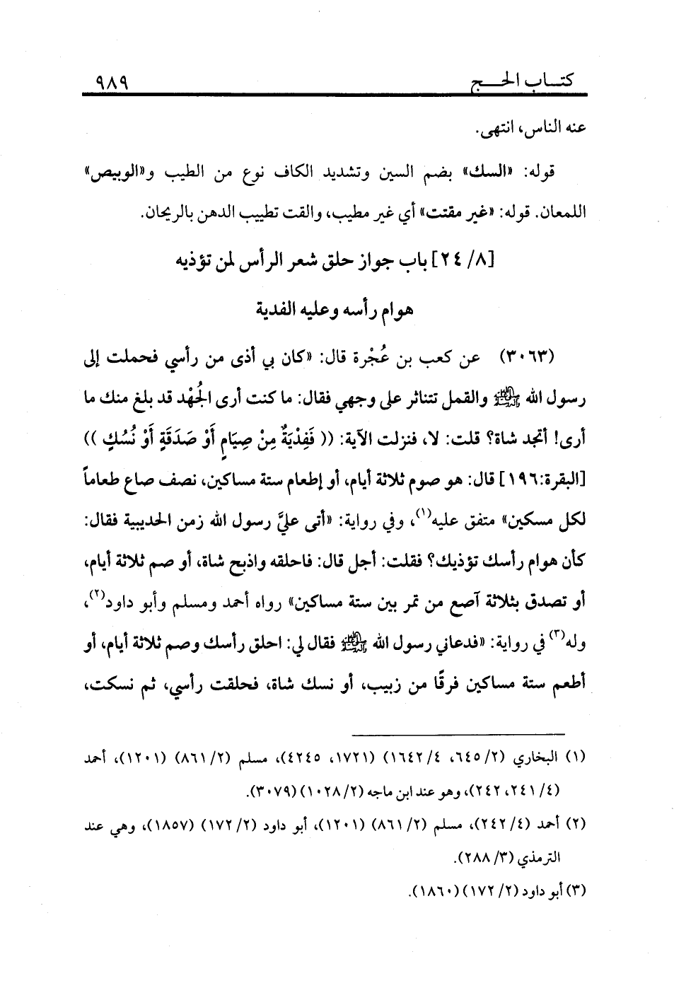 3063 - عن كعب بن عُجْرة قال: «كان بي أذى من رأسي فحملت إلى رسول الله - صلى الله عليه وسلم - والقمل تتناثر على وجهي فقال: ما كنت أرى الجُهْد قد بلغ منك ما أرى! أتجد شاة؟ قلت: لا، فنزلت الآية: ((فَفِدْيَةٌ مِنْ صِيَامٍ أَوْ صَدَقَةٍ أَوْ نُسُكٍ)) [البقرة:196] قال: هو صوم ثلاثة أيام، أو إطعام ستة مساكين، نصف صاع طعاماً لكل مسكين» متفق عليه (¬1) ، وفي رواية: «أتى عليَّ رسول الله زمن الحديبية فقال: كأن هوام رأسك تؤذيك؟ فقلت: أجل قال: فاحلقه واذبح شاة، أو صم ثلاثة أيام، أو تصدق بثلاثة آصع من تمر بين ستة مساكين» رواه أحمد ومسلم وأبو داود (¬2) ، وله (¬3) في رواية: «فدعاني رسول الله - صلى الله عليه وسلم - فقال لي: احلق رأسك وصم ثلاثة أيام أو أطعم ستة مساكين فرقًا من زبيب أو نسك شاة فحلقت رأسي، ثم نسكت،
