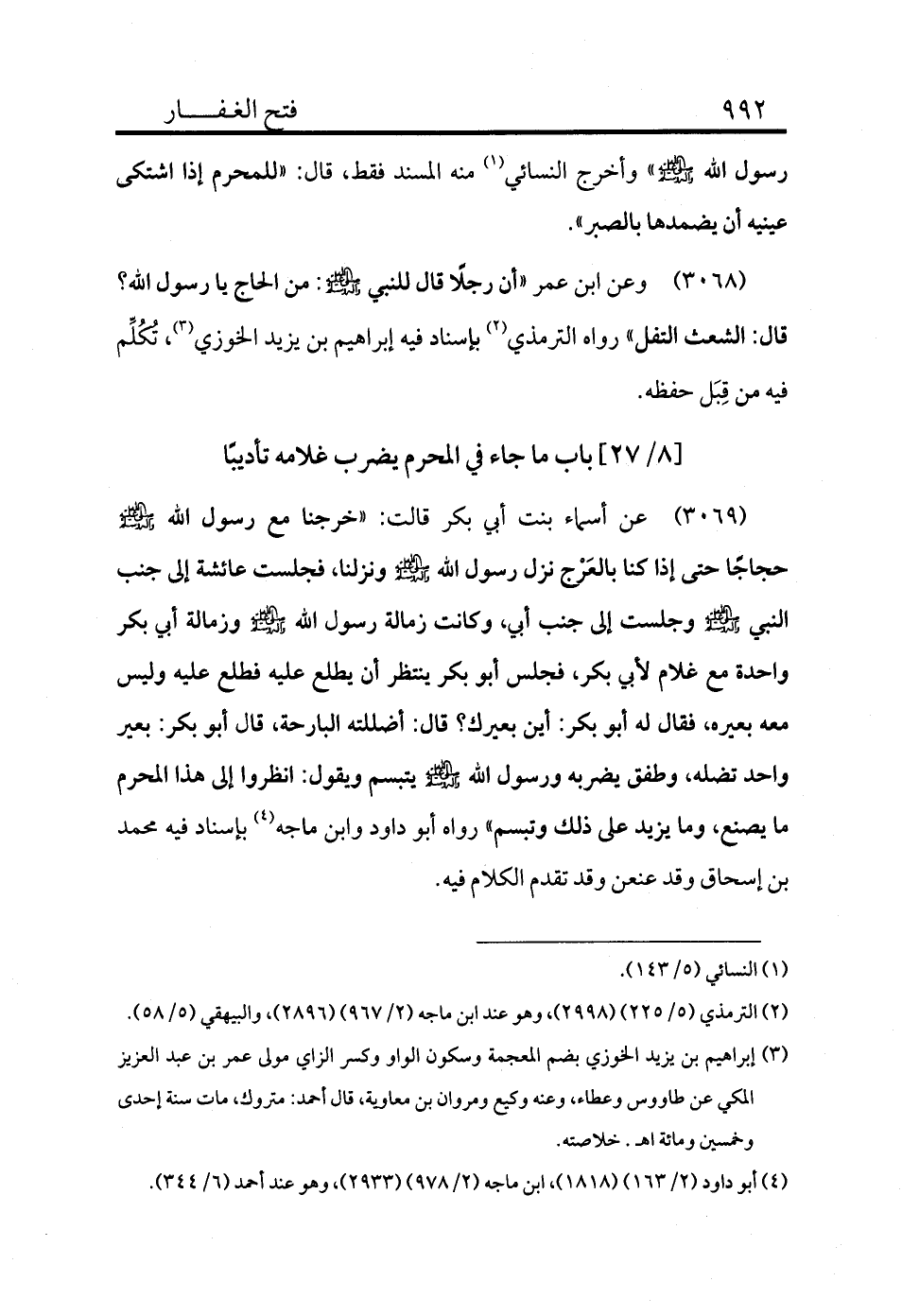 3069 - عن أسماء بنت أبي بكر قالت: «خرجنا مع رسول الله - صلى الله عليه وسلم - حجاجًا حتى إذا كنا بالعَرْج نزل رسول الله - صلى الله عليه وسلم - ونزلنا، فجلست عائشة إلى جنب النبي - صلى الله عليه وسلم - وجلست إلى جنب أبي وكانت زمالة رسول الله - صلى الله عليه وسلم - وزمالة أبي بكر واحدة مع غلام لأبي بكر فجلس أبو بكر ينتظر أن يطلع عليه فطلع عليه وليس معه بعيره، فقال له أبو بكر: أين بعيرك؟ قال: أضللته البارحة، قال أبو بكر: بعير واحد تضله وطفق يضربه ورسول الله - صلى الله عليه وسلم - يتبسم ويقول: انظروا إلى هذا المحرم ما يصنع، وما يزيد على ذلك وتبسم» رواه أبو داود وابن ماجه (¬4) بإسناد فيه محمد بن إسحاق وقد عنعن وقد تقدم الكلام فيه.