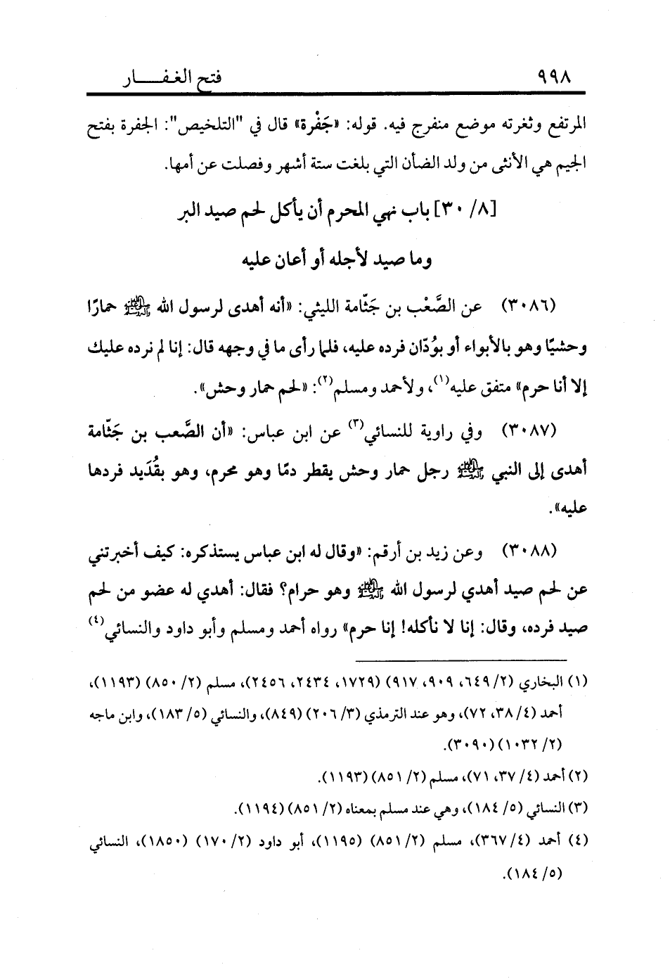 3087 - وفي راوية للنسائي (¬3) عن ابن عباس: «أن الصَّعب بن جَثّامة أهدى إلى النبي - صلى الله عليه وسلم - رجل حمار وحش يقطر دمًا وهو محرم، وهو بقُدَيد فردها عليه» .