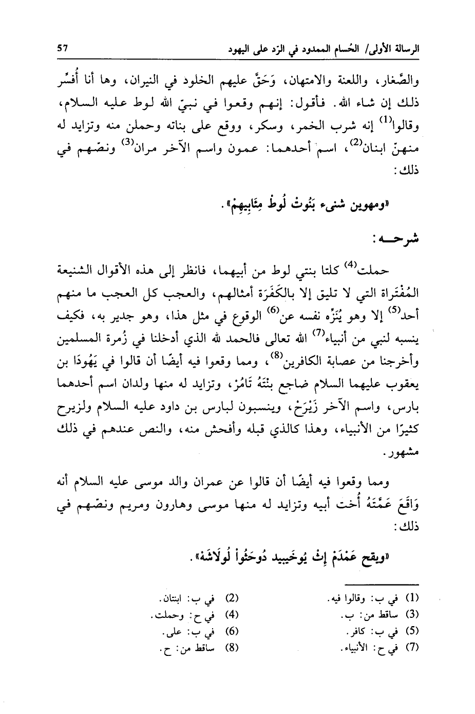 فأقول: إنهم وقعوا في نبي الله لوط عليه السلام وقالوا إنه شرب الخمر وسكر ووقع على بناته وحملن منه وتزايد له منهن ابنان، اسم أحدهما: عمون واسم الآخر مران. ونصهم في ذلك: