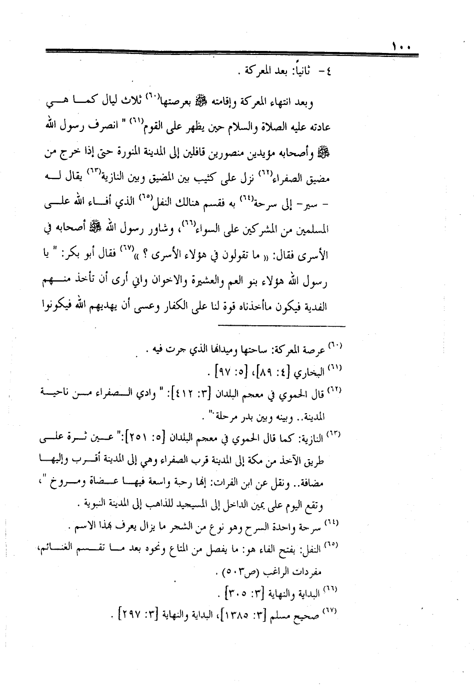 وبعد انتهاء المعركة وإقامته - صلى الله عليه وسلم - بعرصتها ثلاث ليال كما هي عادته عليه الصلاة والسلام حين يظهر على القوم، انصرف رسول الله - صلى الله عليه وسلم - وأصحابه مؤيدين منصورين قافلين إلى المدينة المنورة حتى إذا خرج من مضيق الصفراء نزل على كثيب بين المضيق وبين النازية يقال له -سير- إلى سرحة به فقسم هنالك النفل الذي أفاء الله على المسلمين من المشركين على السواء، وشاور رسول الله - صلى الله عليه وسلم - أصحابه في الأسرى فقال: " ما تقولون في هؤلاء الأسرى؟ " فقال أبو بكر: " يا رسول الله هؤلاء بنو العم والعشيرة والإخوان وإني أرى أن تأخذ منهم الفدية فيكون ما أخذناه قوة لنا على الكفار وعسى أن يهديهم الله فيكونوا
