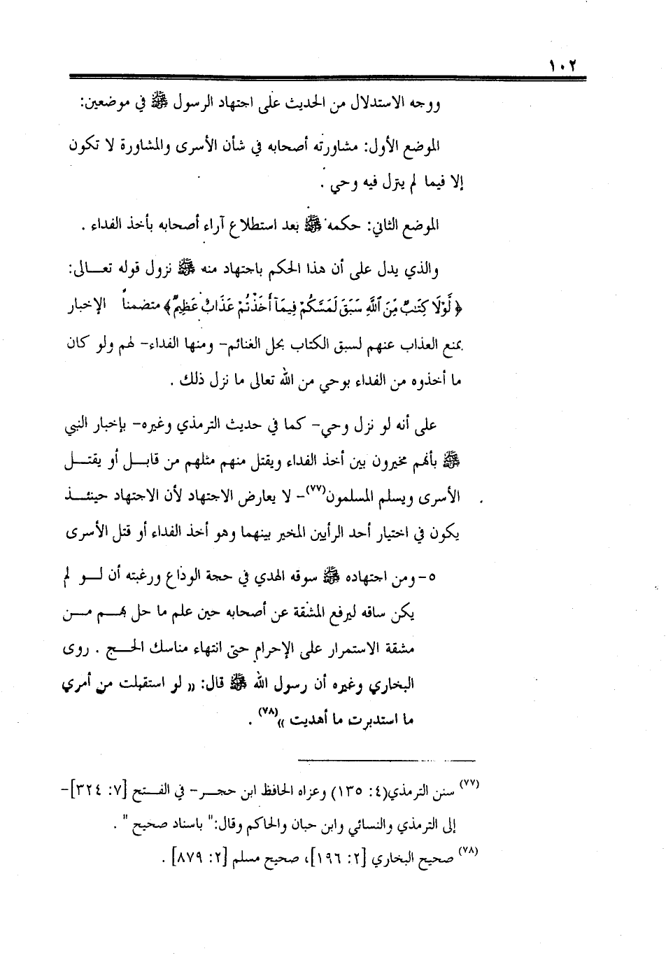 على أنه لو نزل وحي -كما في حديث الترمذي وغيره- بإخبار النبي - صلى الله عليه وسلم - بأنَّهم مخيرون بين أخذ الفداء ويقتل منهم مثلهم من قابل أو يقتل الأسرى ويسلم المسلمون - لا يعارض الاجتهاد لأن الاجتهاد حينئذ يكون في اختيار أحد الرأيين المخير بينهما وهو أخذ الفداء أو قتل الأسرى.