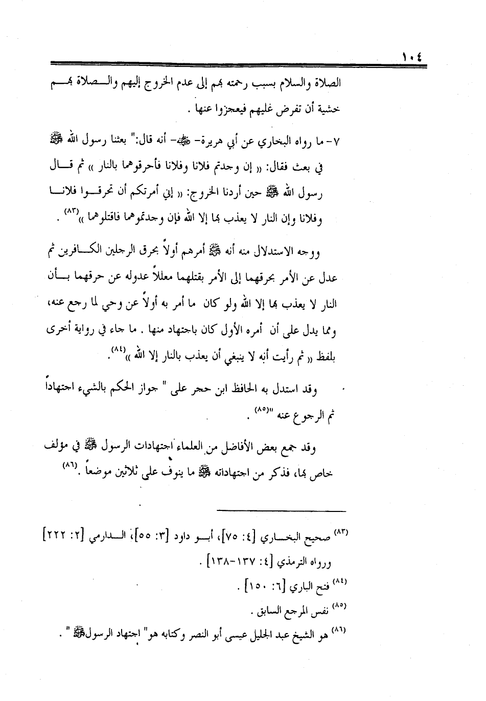ووجه الاستدلال منه أنه - صلى الله عليه وسلم - أمرهم أولاً بحرق الرجلين الكافرين ثم عدل عن الأمر بحرقهما إلى الأمر بقتلهما معللاً عدوله عن حرقهما بأن النار لا يعذب بها إلا الله ولو كان ما أمر به أولاً عن وحي لما رجع عنه، ومما يدل على أن أمره الأول كان باجتهاد منه. ما جاء في رواية أخرى بلفظ " ثم رأيت أنه لا ينبغى أن يعذب بالنار إلا الله ".