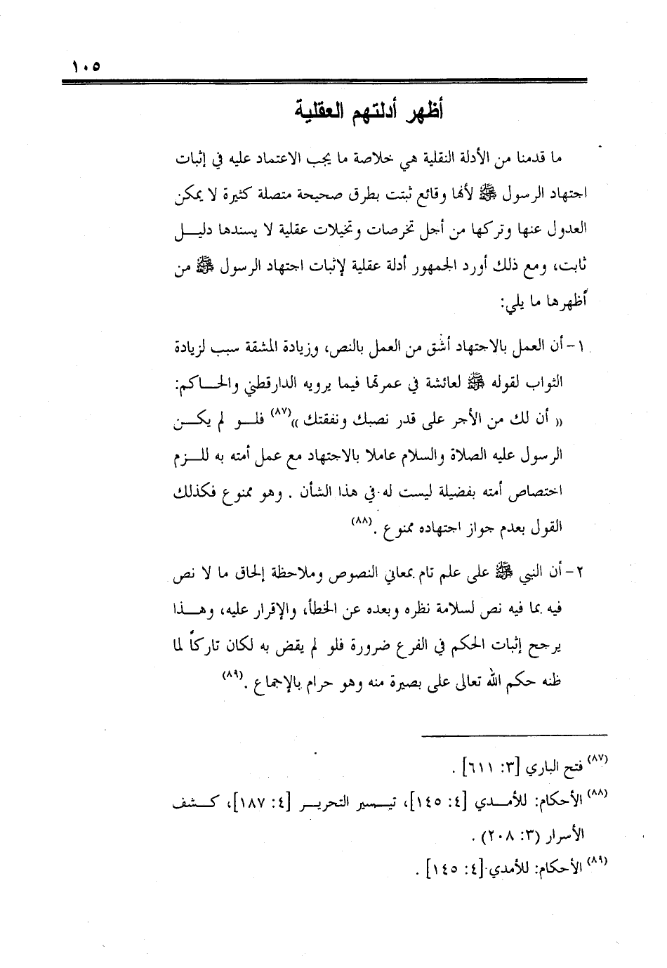 ما قدمنا من الأدلة النقلية هي خلاصة ما يجب الاعتماد عليه في إثبات اجتهاد الرسول - صلى الله عليه وسلم - لأنها وقائع ثبتت بطرق صحيحة متصلة كثيرة لا يمكن العدول عنها وتركها من أجل تخرصات وتخيلات عقلية لا يسندها دليل ثابت، ومع ذلك أورد الجمهور أدلة عقلية لإثبات اجتهاد الرسول - صلى الله عليه وسلم - من أظهرها ما يلى: