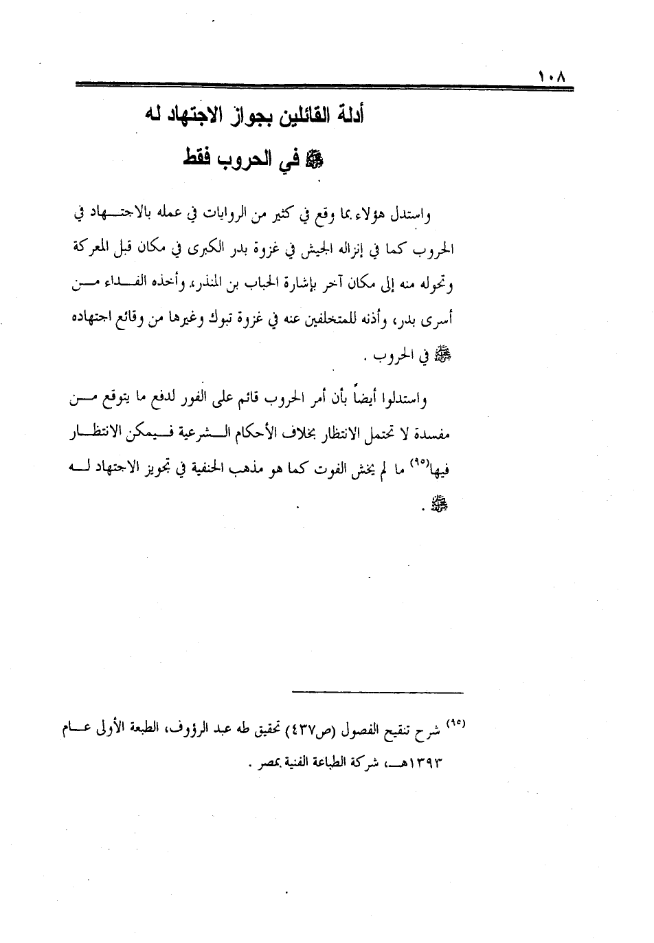 واستدلوا أيضاً بأن أمر الحروب قائم على الفور لدفع ما يتوقع من مفسدة لا تحتمل الانتظار بخلاف الأحكام الشرعية فيمكن الانتظار فيها ما لم يخش الفوت كما هو مذهب الحنفية في تجويز الاجتهاد له - صلى الله عليه وسلم.