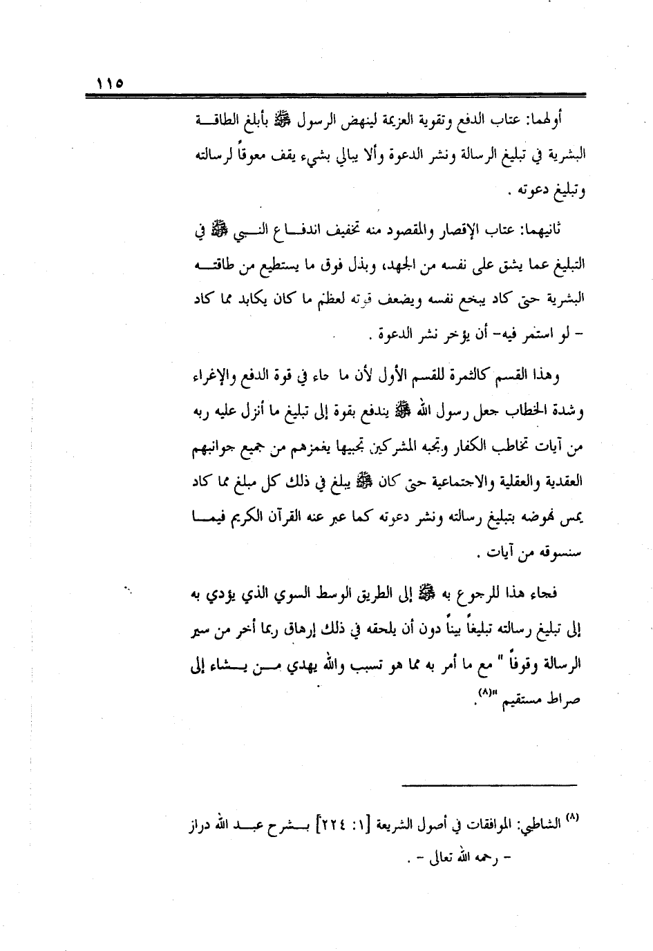 فجاء هذا للرجوع به - صلى الله عليه وسلم - إلى الطريق الوسط السوي الذي يؤدي به إلى تبليغ رسالته تبليغاً بيناً دون أن يلحقه في ذلك إرهاق ربما أخر من سير الرسالة وقوفاً " مع ما أمر به مما هو تسبب والله يهدي من يشاء إلى صراط مستقيم ".
