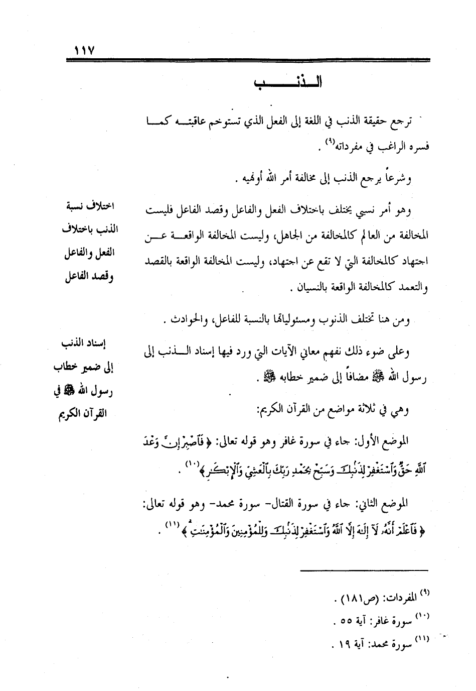 وعلى ضوء ذلك نفهم معاني الآيات التي ورد فيها إسناد الذنب إلى رسول الله - صلى الله عليه وسلم - مضافا إلى ضمير خطابه - صلى الله عليه وسلم -.