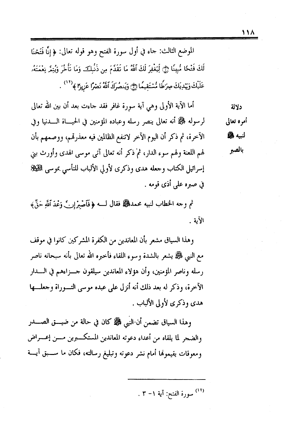 الموضع الثالث: جاء في أول سورة الفتح وهو قوله تعالى: (إِنَّا فَتَحْنَا لَكَ فَتْحًا مُبِينًا (1) لِيَغْفِرَ لَكَ اللهُ مَا تَقَدَّمَ مِنْ ذَنْبِكَ وَمَا تَأَخَّرَ وَيُتِمَّ نِعْمَتَهُ عَلَيْكَ وَيَهْدِيَكَ صِرَاطًا مُسْتَقِيمًا (2) وَيَنْصُرَكَ اللهُ نَصْرًا عَزِيزًا (3)).