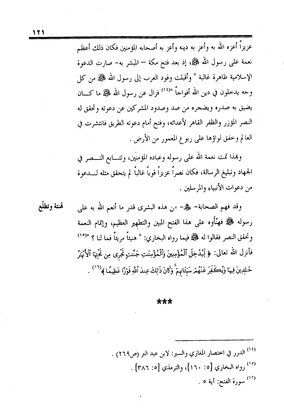 عزيزاً أعزه الله به وأعز به دينه وأعز به أصحابه المؤمنين فكان ذلك أعظم نعمة على رسول الله - صلى الله عليه وسلم -، إذ بعد فتح مكة -المبشر به- صارت الدعوة الإسلامية ظاهرة غالبة "، وأقبلت وفود العرب إلى رسول الله - صلى الله عليه وسلم - من كل وجه يدخلون في دين الله أفواجاً، فزال عن رسول الله - صلى الله عليه وسلم - ما كان يضيق به صدره ويضجره من صد وصدود المشركين من دعوته وتحقق له النصر المؤزر والظفر القاهر لأعدائه، وفتح أمام دعوته الطريق فانتشرت في العالم وخفق لواؤها على ربوع المعمور من الأرض.