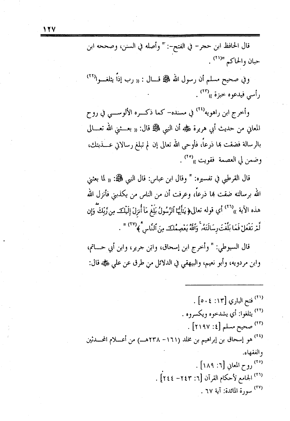 وأخرج ابن راهويه في مسنده - كما ذكره الآلوسى في روح المعاني من حديث أبي هريرة - رضي الله عنه - أن النبي - صلى الله عليه وسلم - قال: " بعثني الله تعالى بالرسالة فضقت بها ذرعاً، فأوحى الله تعالى إن لم تبلغ رسالاتي عذبتك، وضمن لي العصمة فقويت ".