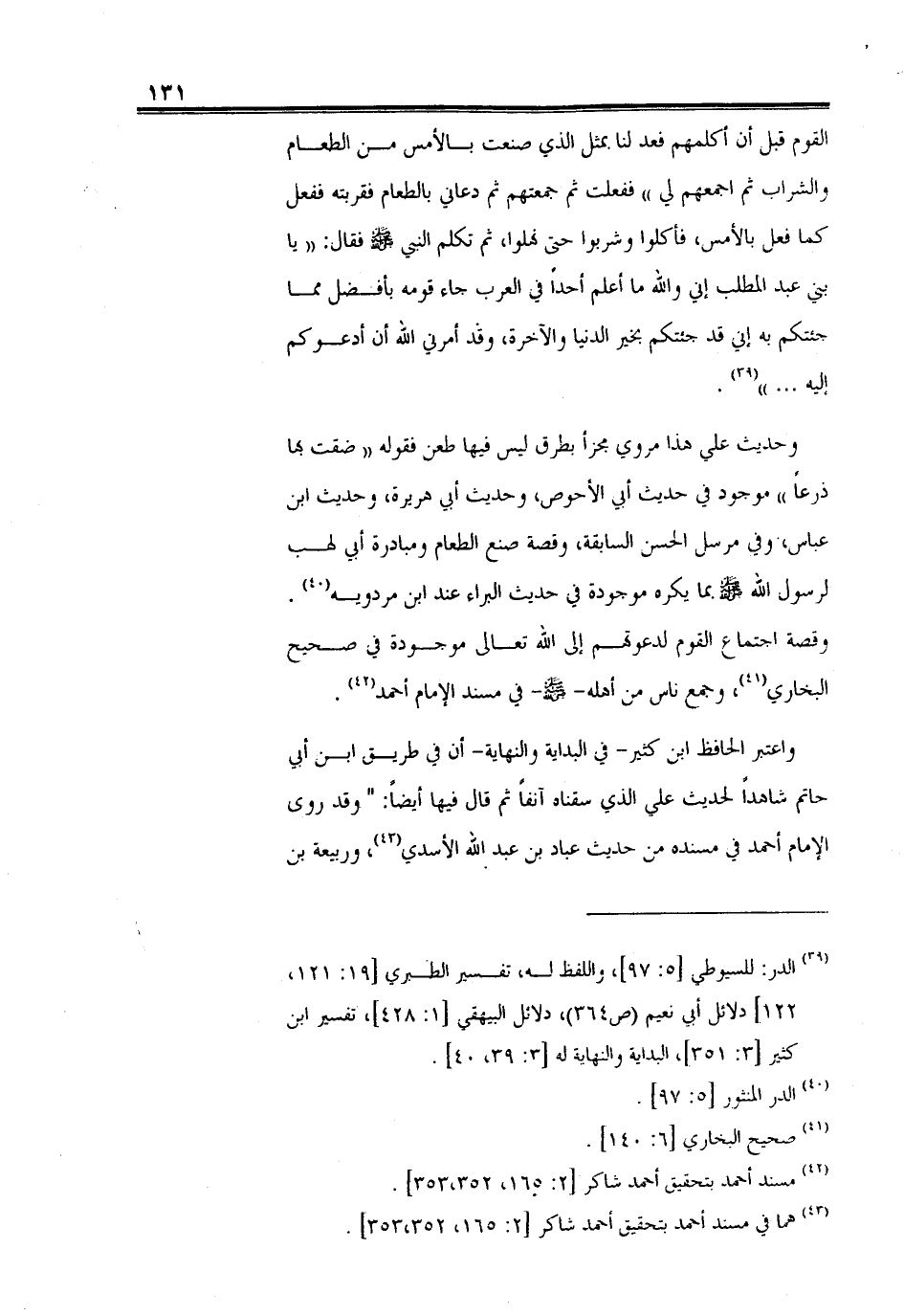القوم قبل أن أكلمهم فعد لنا بمثل الذي صنعت بالأمس من الطعام والشراب ثم اجمعهم لي " ففعلت ثم جمعتهم ثم دعاني بالطعام فقربته ففعل كما فعل بالأمس، فأكلوا وشربوا حتى نهلوا، ثم تكلم النبي - صلى الله عليه وسلم - فقال: " يا بني عبد المطلب إني والله ما أعلم أحداً في العرب جاء قومه بأفضل مما جئتكم به إني قد جئتكم بخير الدنيا والآخرة، وقد أمرني الله أن أدعوكم إليه. . ".