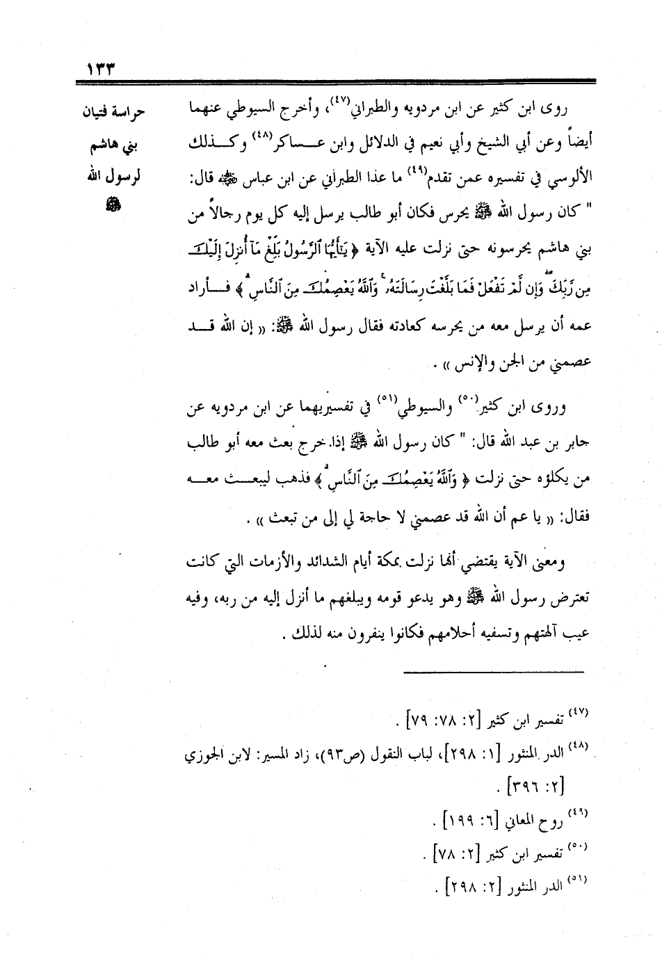 روى ابن كثير عن ابن مردويه والطبراني، وأخرج السيوطي عنهما أيضاً وعن أبي الشيخ وأبي نعيم في الدلائل وابن عساكر وكذلك الآلوسي في تفسيره عمن تقدم ما عدا الطبراني عن ابن عباس - رضي الله عنهما - قال: " كان رسول الله - صلى الله عليه وسلم - يحرس فكان أبو طالب يرسل إليه كل يوم رجالاً من بني هاشم يحرسونه حتى نزلت عليه الآية (يَا أَيُّهَا الرَّسُولُ بَلِّغْ مَا أُنْزِلَ إِلَيْكَ مِنْ رَبِّكَ وَإِنْ لَمْ تَفْعَلْ فَمَا بَلَّغْتَ رِسَالَتَهُ وَاللهُ يَعْصِمُكَ مِنَ النَّاسِ) فأراد عمه أن يرسل معه من يحرسه كعادته فقال رسول الله - صلى الله عليه وسلم -: " إن الله قد عصمني من الجن والإنس ".