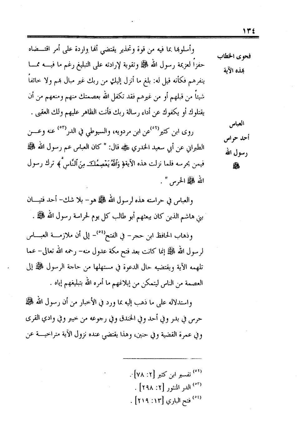 وذهاب الحافظ لبن حجر -في الفتح- إلى أن ملازمة العباس لرسول الله - صلى الله عليه وسلم - إنما كانت بعد فتح مكة عدول منه - رحمه الله تعالى - عما تلهمه الآية ويقتضيه حال الدعوة في مستهلها من حاجة الرسول - صلى الله عليه وسلم - إلى العصمة من الناس ليتمكن من إبلاغهم ما أمره الله بتبليغهم إياه.