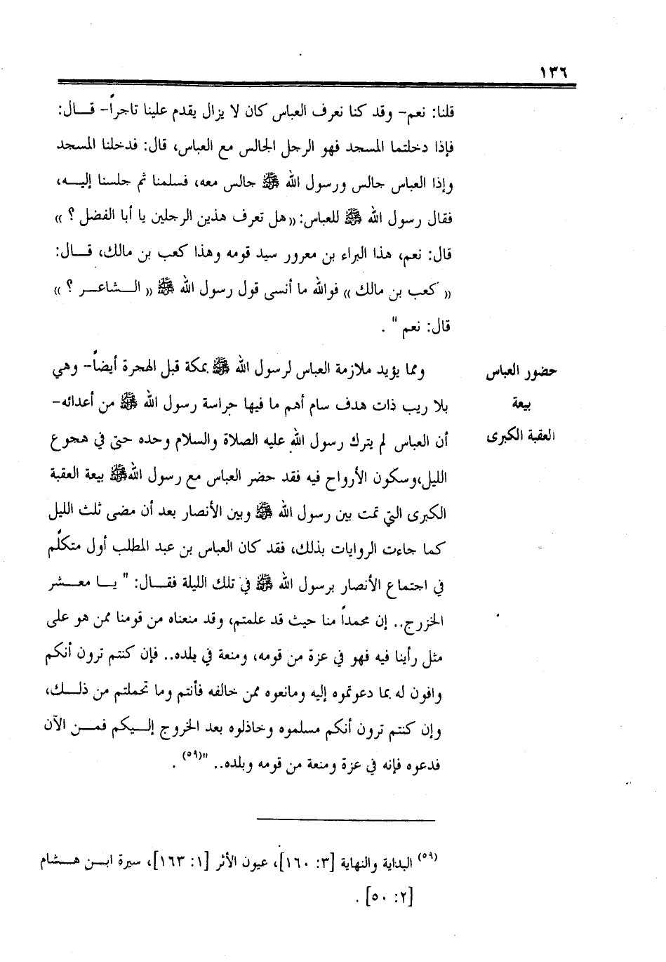قلنا: نعم -وقد كنا نعرف العباس كان لا يزال يقدم علينا تاجراً- قال: فإذا دخلت المسجد فهو الرجل الجالس مع العباس، قال: فدخلنا المسجد وإذا العباس جالس ورسول الله - صلى الله عليه وسلم - جالس معه، فسلمنا ثم جلسنا إليه، فقال رسول الله - صلى الله عليه وسلم - للعباس: " هل تعرف هذين الرجلين يا أبا الفضل؟ " قال: نعم، هذا البراء بن معرور سيد قومه وهذا كعب بن مالك، قال: " كعب بن مالك " فوالله ما أنسى قول رسول الله - صلى الله عليه وسلم - " الشاعر؟ " قال: نعم ".