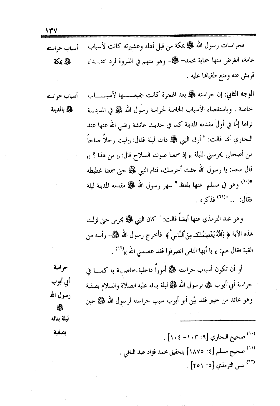 الوجه الثاني: إن حراسته - صلى الله عليه وسلم - بعد الهجرة كانت جميعها لأسباب خاصة. وباستقصاء الأسباب الخاصة لحراسة رسول الله - صلى الله عليه وسلم - في المدينة نراها إما في أول مقدمه المدينة كما في حديث عائشة رضى الله عنها عند البخاري أنها قالت: " أرق النبي - صلى الله عليه وسلم - ذات ليلة فقال: " ليت رجلاً صالحاً من أصحابي يحرسني الليلة " إذ سمعنا صوت السلاح قال؟ " من هذا؟ " قال سعد: يا رسول الله جئت أحرسك، فنام النبي - صلى الله عليه وسلم - حتى سمعنا غطيطه " وهو في مسلم عنها بلفظ " سهر رسول الله - صلى الله عليه وسلم - مقدمه المدينة ليلة فقال: " فذكره.
