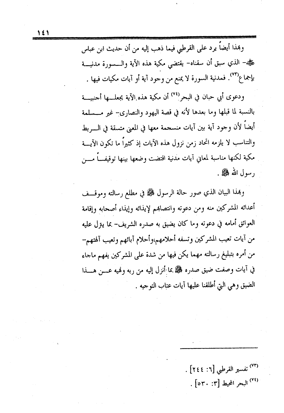 وبهذا أيضاً يرد على القرطبي فيما ذهب إليه من أن حديث ابن عباس - رضي الله عنهما - -الذي سبق أن سقناه- يقتضي مكية هذه الآية والسورة مدنية بإجماع. فمدنية السورة لا يمنع من وجود آية أو آيات مكيات فيها.