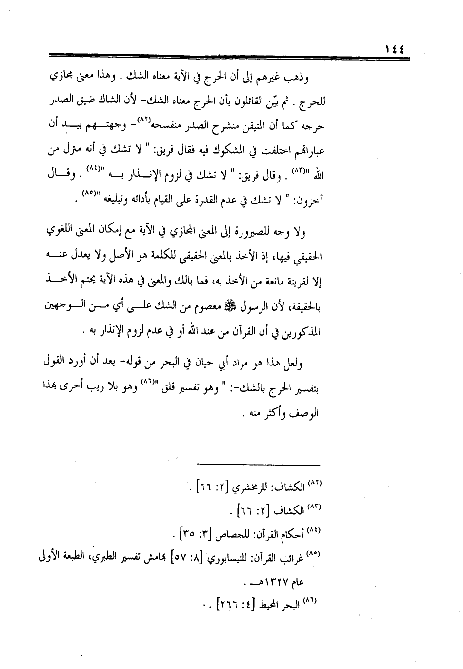 ولعل هذا هو مراد أبي حيان في البحر من قوله -بعد أن أورد القول بتفسير الحرج بالشك-: " وهو تفسير قلق " وهو بلا ريب أحرى بهذا الوصف وأكثر منه.