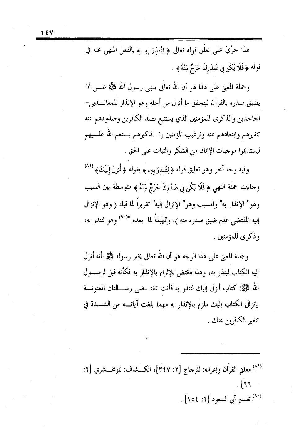 وفيه وجه آخر: وهو تعليق قوله (لِتُنْذِرَ بِهِ) بقوله (أُنْزِلَ إِلَيْكَ) وجاءت جملة النهي (فَلَا يَكُنْ فِي صَدْرِكَ حَرَجٌ مِنْهُ) متوسطة بين السبب وهو " الإنذار " به والمسبب وهو " المنزل إليه " تقريراً لما قبله (وهو الإنزال إليه المقتضى عدم ضيق صدره منه)، وتمهيداً لما بعده وهو (لِتُنْذِرَ بِهِ وَذِكْرَى لِلْمُؤْمِنِينَ).