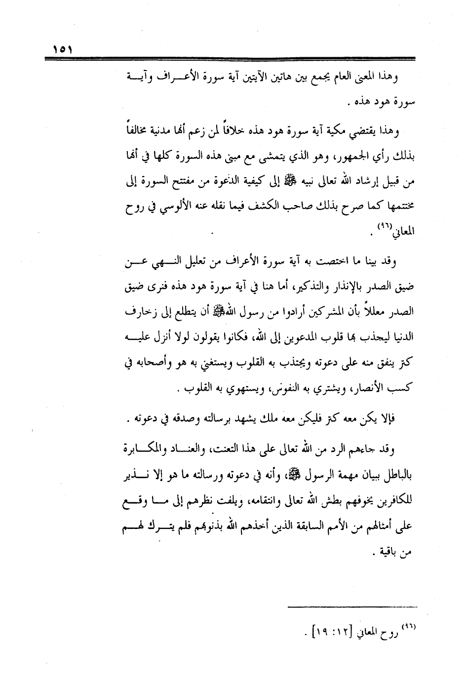 وهذا يقتضي مكية آية سورة هود هذه خلافاً لمن زعم أنها مدنية مخالفاً بذلك رأي الجمهور، وهو الذي يتمشى مع مبنى هذه السورة كلها في أنها من قبيل إرشاد الله تعالى نبيه - صلى الله عليه وسلم - إلى كيفية الدعوة من مفتتح السورة إلى مختتمها كما صرح بذلك صاحب الكشف فيما نقله عنه الألوسي فِي روح المعاني.
