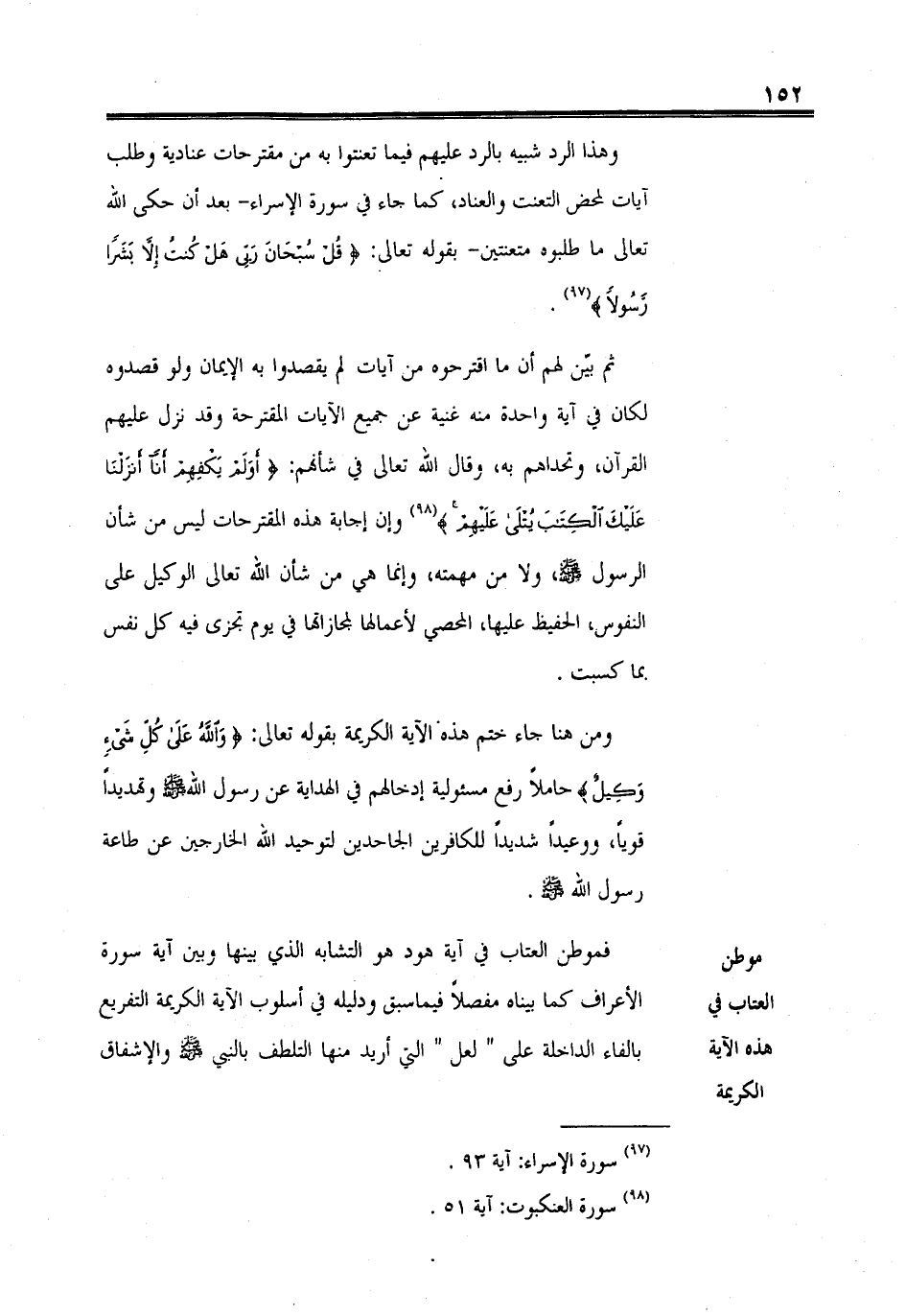 ثم بيّن لهم أن ما اقترحوه من آيات لم يقصدوا به الإيمان ولو قصدوه لكان في آية واحدة منه غنية عن جميع الآيات المقترحة وقد نزل عليهم القرآن، وتحداهم به، وقال الله تعالى في شأنهم: (أَوَلَمْ يَكْفِهِمْ أَنَّا أَنْزَلْنَا عَلَيْكَ الْكِتَابَ يُتْلَى عَلَيْهِمْ) وإن إجابة هذه المقترحات ليس من شأن الرسول - صلى الله عليه وسلم - ولا من مهمته وإنما هي من شأن الله تعالى الوكيل على النفوس، الحفيظ عليها، المحصي لأعمالها لمجازاتها في يوم تجزى فيه كل نفس بما كسبت.