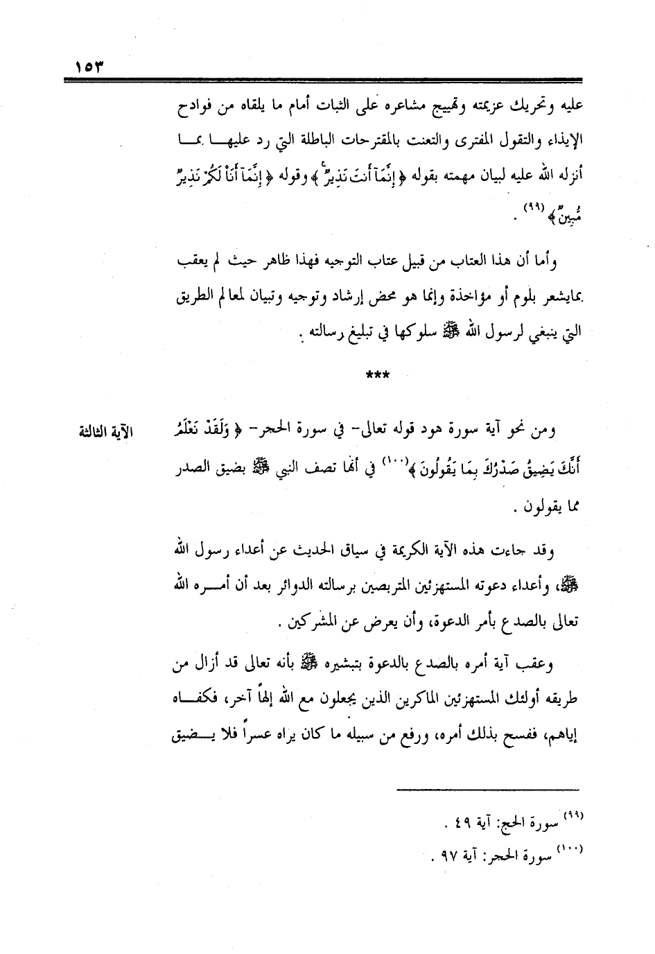 ومن نحو آية سورة هود قوله تعالى -في سورة الحجر- (وَلَقَدْ نَعْلَمُ أَنَّكَ يَضِيقُ صَدْرُكَ بِمَا يَقُولُونَ (97)) في أنها تصف النبي - صلى الله عليه وسلم - بضيق الصدر مما يقولون.