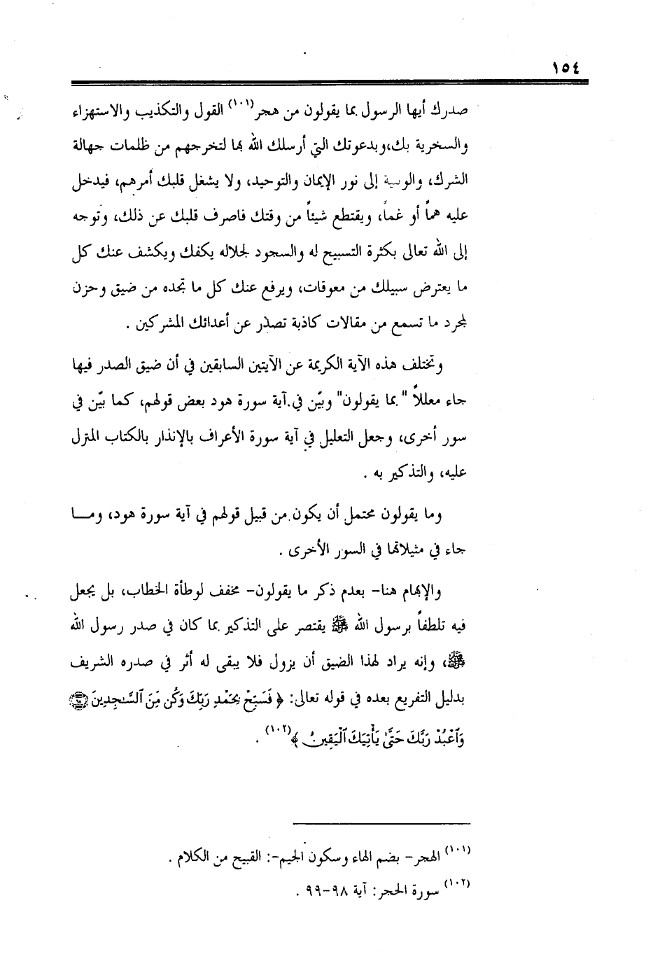 والإبهام هنا -بعدم ذكر ما يقولون- مخفف لوطأة الخطاب، بل يجعل فيه تلطفاً برسول الله - صلى الله عليه وسلم - يقتصر على التذكير بما كان فِي صدر رسول الله - صلى الله عليه وسلم -، وإنه يراد لهذا الضيق أن يزول فلا يبقى له أثر في صدره الشريف بدليل التفريع بعده في قوله تعالى: (فَسَبِّحْ بِحَمْدِ رَبِّكَ وَكُنْ مِنَ السَّاجِدِينَ (98) وَاعْبُدْ رَبَّكَ حَتَّى يَأْتِيَكَ الْيَقِينُ (99)).