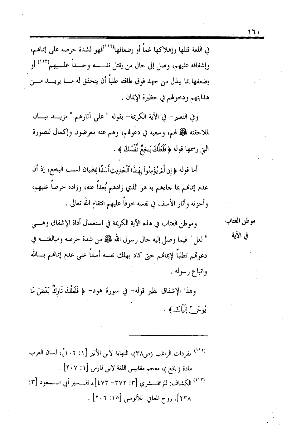 وموطن العتاب في هذه الآية الكريمة في استعمال أداة الإشفاق وهي " لعل " فيما وصل إليه حال رسول الله - صلى الله عليه وسلم - من شدة حرصه ومبالغته في دعوتهم تطلباً لإيمانهم حتى كاد يهلك نفسه أسفاً على عدم إيمانهم بالله واتباع رسوله.