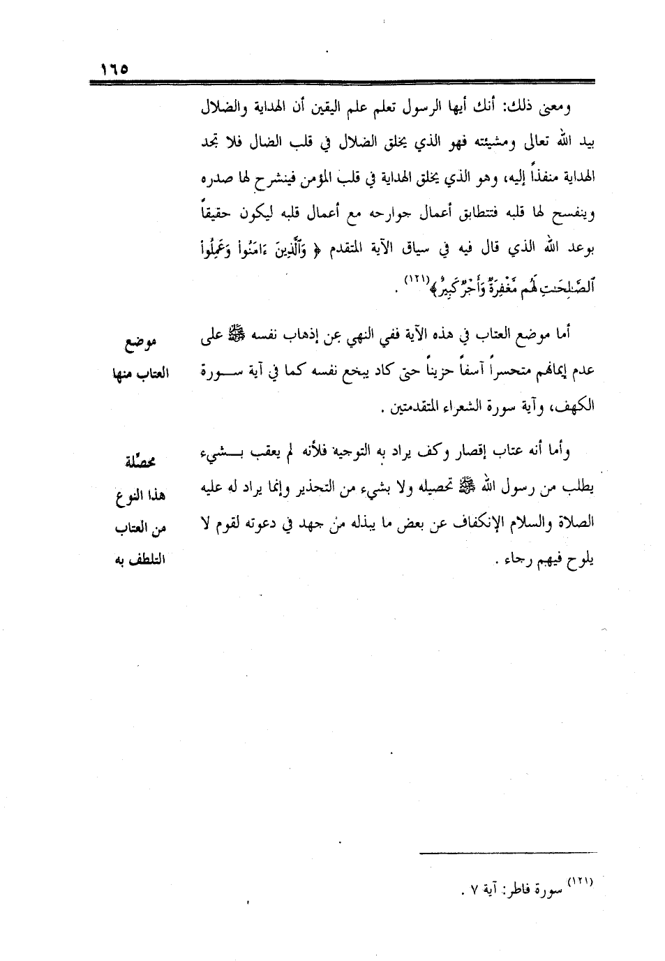وأما أنه عتاب إقصار وكف يراد بهما التوجيه فلأنه لم يعقب بشيء ويطلب من رسول الله - صلى الله عليه وسلم - تحصيله ولا بشىء من التحذير وإنما يراد له عليه الصلاة والسلام الانكفاف عن بعض ما يبذله من جهد في دعوته لقوم لا يلوح فيهم رجاء.