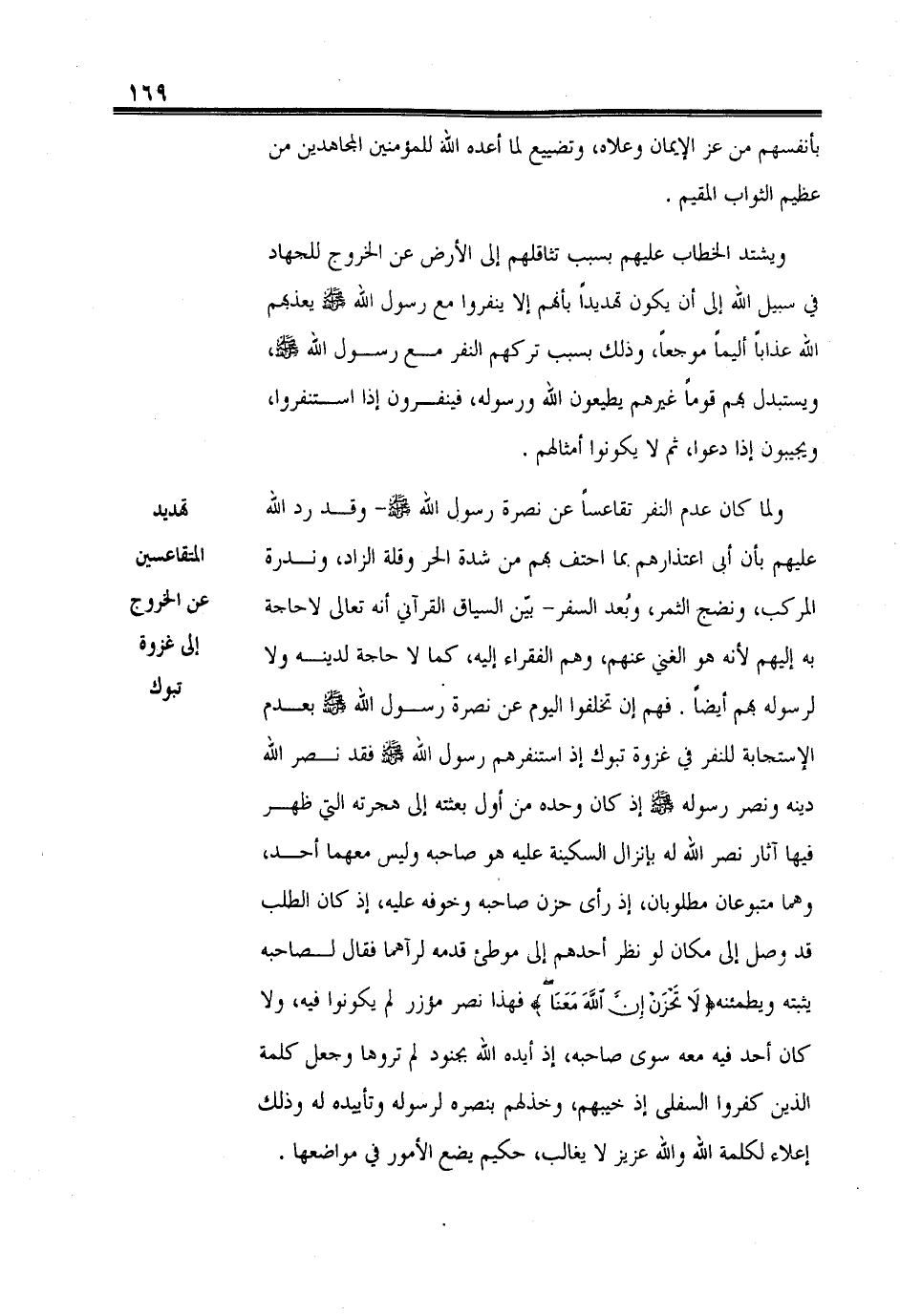 ولما كان عدم النفر تقاعساً عن نصرة رسول الله - صلى الله عليه وسلم -وقد رد الله عليهم بأن أبى اعتذارهم بما احتف بهم من شدة الحر وقلة الزاد، وندرة المركب، ونضج الثمر، وبُعد السفر - بيّن السياق القرآني أنه تعالى لا حاجة به إليهم لأنه هو الغني عنهم، وهم الفقراء إليه، كما لا حاجة لدينه ولا لرسوله - صلى الله عليه وسلم - بهم أيضاً. فهم إن تخلفوا اليوم عن نصرة رسول الله - صلى الله عليه وسلم - بعدم الإستجابة للنفر في غزوة تبوك إذ استنفرهم رسول الله - صلى الله عليه وسلم - فقد نصر الله دينه ونصر رسوله - صلى الله عليه وسلم - إذ كان وحده من أول بعثته إلى هجرته التي ظهر فيها آثار نصر الله له بإنزال السكينة عليه هو وصاحبه وليس معهما أحد، وهما متبوعان مطلوبان، إذ رأى حزن صاحبه وخوفه عليه، إذ كان الطلب قد وصل إلى مكان لو نظر أحدهم إلى موطئ قدمه لرآهما فقال لصاحبه يثبته ويطمئنه (لَا تَحْزَنْ إِنَّ اللهَ مَعَنَا) فهذا نصر مؤزر لم يكونوا فيه، ولا كان أحد فيه معه سوى صاحبه، إذ أيده الله بجنود لم تروها وجعل كلمة الذين كفررا السفلى إذ خيبهم، وخذلهم بنصره لرسوله وتأييده له وذلك إعلاء لكلمة الله والله عزيز لا يغالب، حكيم يضع الأمور في مواضعها.