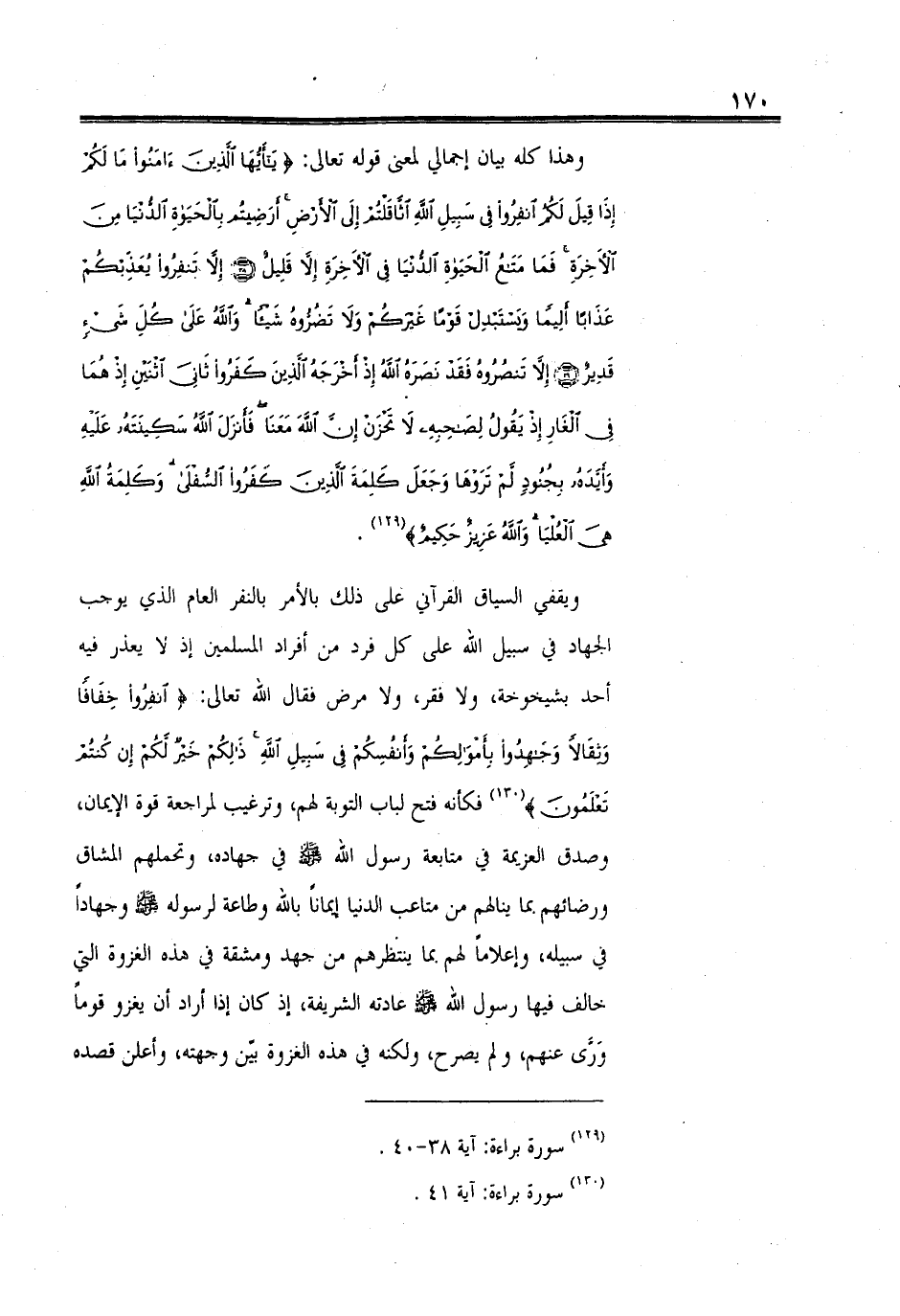 وهذا كله بيان إجمالي لمعنى قوله تعالى: (يَا أَيُّهَا الَّذِينَ آمَنُوا مَا لَكُمْ إِذَا قِيلَ لَكُمُ انْفِرُوا فِي سَبِيلِ اللهِ اثَّاقَلْتُمْ إِلَى الْأَرْضِ أَرَضِيتُمْ بِالْحَيَاةِ الدُّنْيَا مِنَ الْآخِرَةِ فَمَا مَتَاعُ الْحَيَاةِ الدُّنْيَا فِي الْآخِرَةِ إِلَّا قَلِيلٌ (38) إِلَّا تَنْفِرُوا يُعَذِّبْكُمْ عَذَابًا أَلِيمًا وَيَسْتَبْدِلْ قَوْمًا غَيْرَكُمْ وَلَا تَضُرُّوهُ شَيْئًا وَاللهُ عَلَى كُلِّ شَيْءٍ قَدِيرٌ (39) إِلَّا تَنْصُرُوهُ فَقَدْ نَصَرَهُ اللهُ إِذْ أَخْرَجَهُ الَّذِينَ كَفَرُوا ثَانِيَ اثْنَيْنِ إِذْ هُمَا فِي الْغَارِ إِذْ يَقُولُ لِصَاحِبِهِ لَا تَحْزَنْ إِنَّ اللهَ مَعَنَا فَأَنْزَلَ اللهُ سَكِينَتَهُ عَلَيْهِ وَأَيَّدَهُ بِجُنُودٍ لَمْ تَرَوْهَا وَجَعَلَ كَلِمَةَ الَّذِينَ كَفَرُوا السُّفْلَى وَكَلِمَةُ اللهِ هِيَ الْعُلْيَا وَاللهُ عَزِيزٌ حَكِيمٌ (40)).
