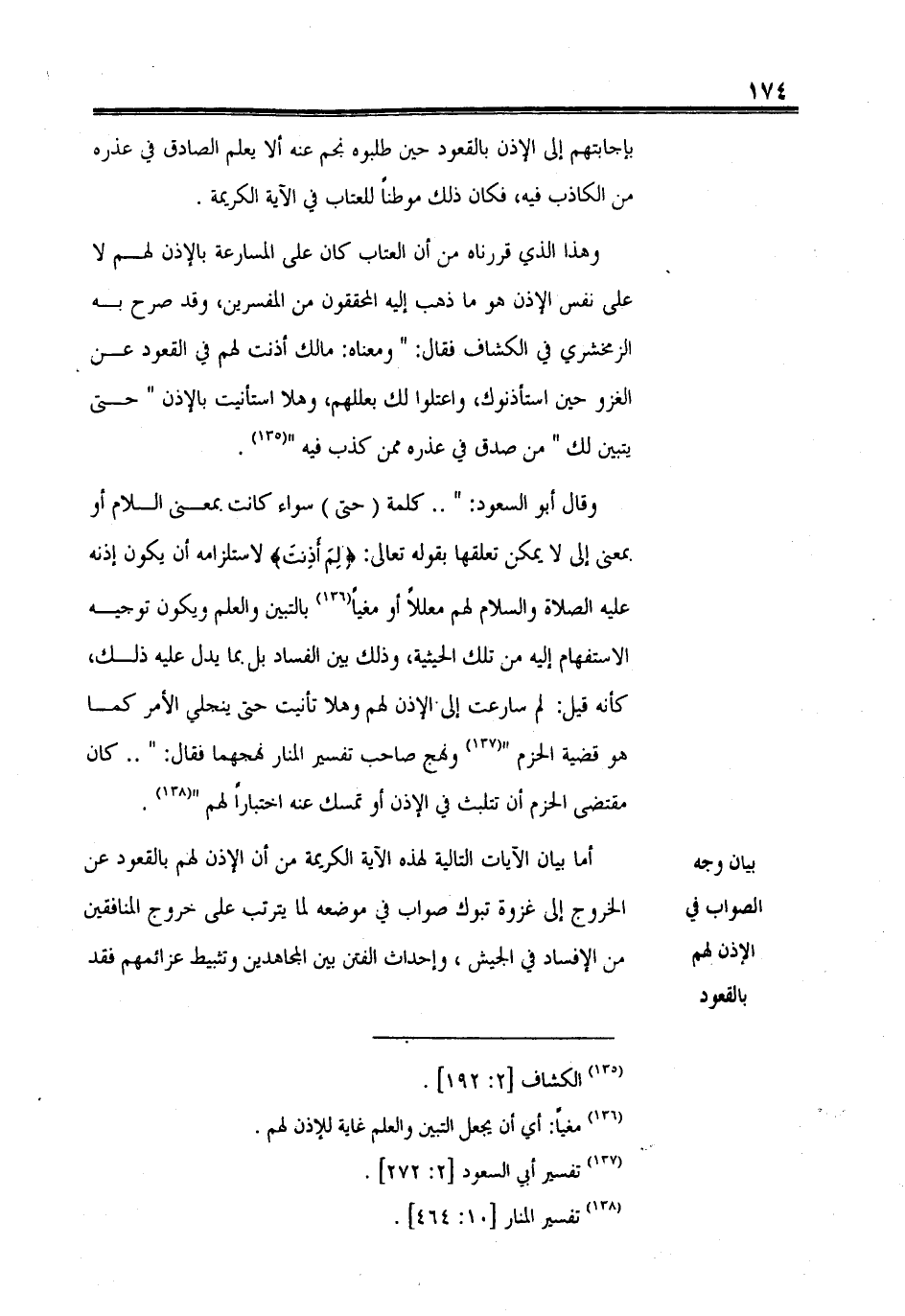 وهذا الذي قررناه من أن العتاب كان على المسارعة بالإذن لهم لا على نفس الإذن هو ما ذهب إليه المحققون من المفسرين، وقد صرح به الزمخشري في الكشاف فقال: " ومعناه: ما لك أذنت لهم في القعود عن الغزو حين استأذنوك، واعتلوا لك بعللهم، وهلا استأنيت بالأذن " حتى يتبين لك " من صدق في عذره ممن كذب فيه ".
