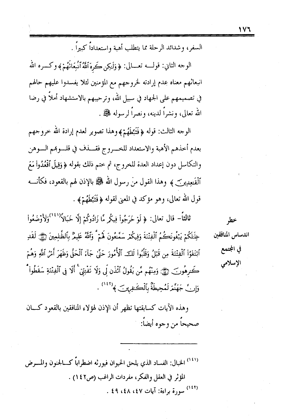 ثالثاً - قال تعالى: (لَوْ خَرَجُوا فِيكُمْ مَا زَادُوكُمْ إِلَّا خَبَالًا وَلَأَوْضَعُوا خِلَالَكُمْ يَبْغُونَكُمُ الْفِتْنَةَ وَفِيكُمْ سَمَّاعُونَ لَهُمْ وَاللهُ عَلِيمٌ بِالظَّالِمِينَ (47) لَقَدِ ابْتَغَوُا الْفِتْنَةَ مِنْ قَبْلُ وَقَلَّبُوا لَكَ الْأُمُورَ حَتَّى جَاءَ الْحَقُّ وَظَهَرَ أَمْرُ اللهِ وَهُمْ كَارِهُونَ (48) وَمِنْهُمْ مَنْ يَقُولُ ائْذَنْ لِي وَلَا تَفْتِنِّي أَلَا فِي الْفِتْنَةِ سَقَطُوا وَإِنَّ جَهَنَّمَ لَمُحِيطَةٌ بِالْكَافِرِينَ (49)).