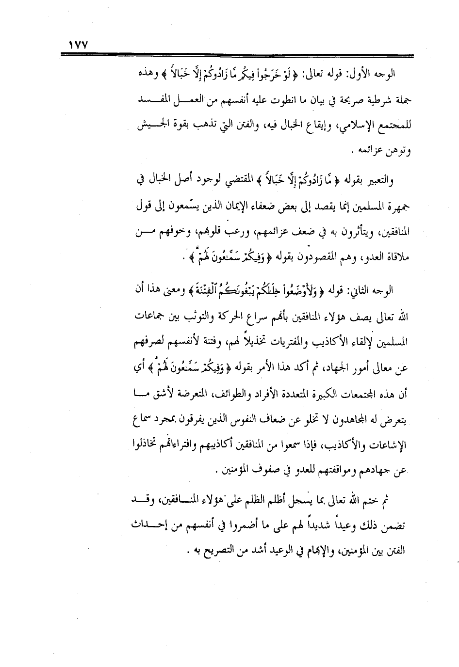 الوجه الأول: قوله تعالى: (لَوْ خَرَجُوا فِيكُمْ مَا زَادُوكُمْ إِلَّا خَبَالًا) وهذه جملة شرطية صريحة في بيان ما انطوت عليه أنفسهم من العمل المفسد للمجتمع الإسلامي، وإيقاع الخبال فيه، والفتن التي تذهب بقوة الجيش وتوهن عزائمه.