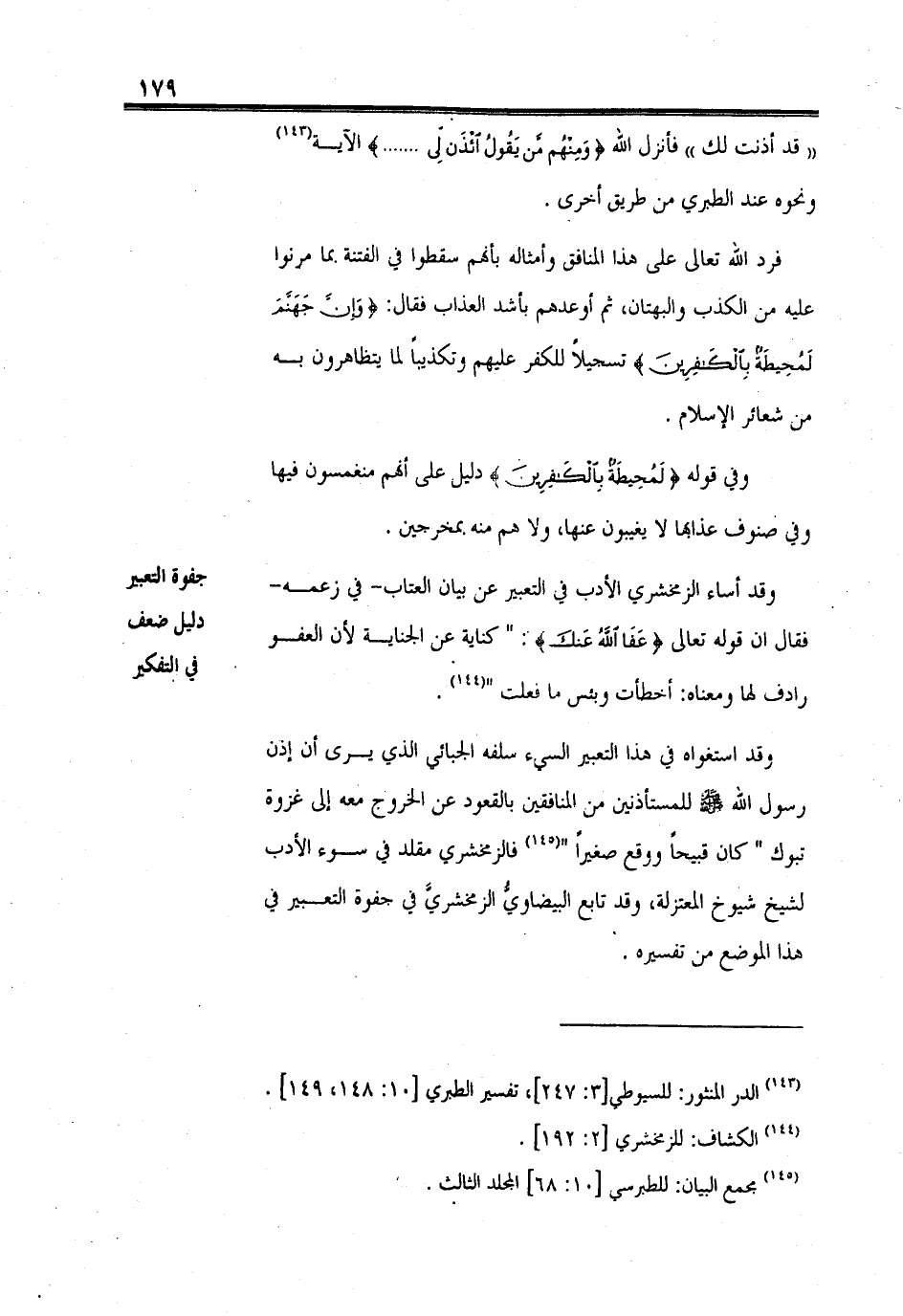 وقد استغواه في هذا التعبير السيئ سلفه الجبائى الذي يرى أن إذن رسول الله - صلى الله عليه وسلم - للمستأذنين من المنافقين بالقعود عن الخروج معه إلى غزوة تبوك " كان قبيحاً ووقع صغيرًا " فالزمخشري مقلد في سوء الأدب لشيخ شيوخ المعتزلة، وقد تابع البيضاويُّ الزمخشري في جفوة التعبير في هذا الموضع من تفسيره.
