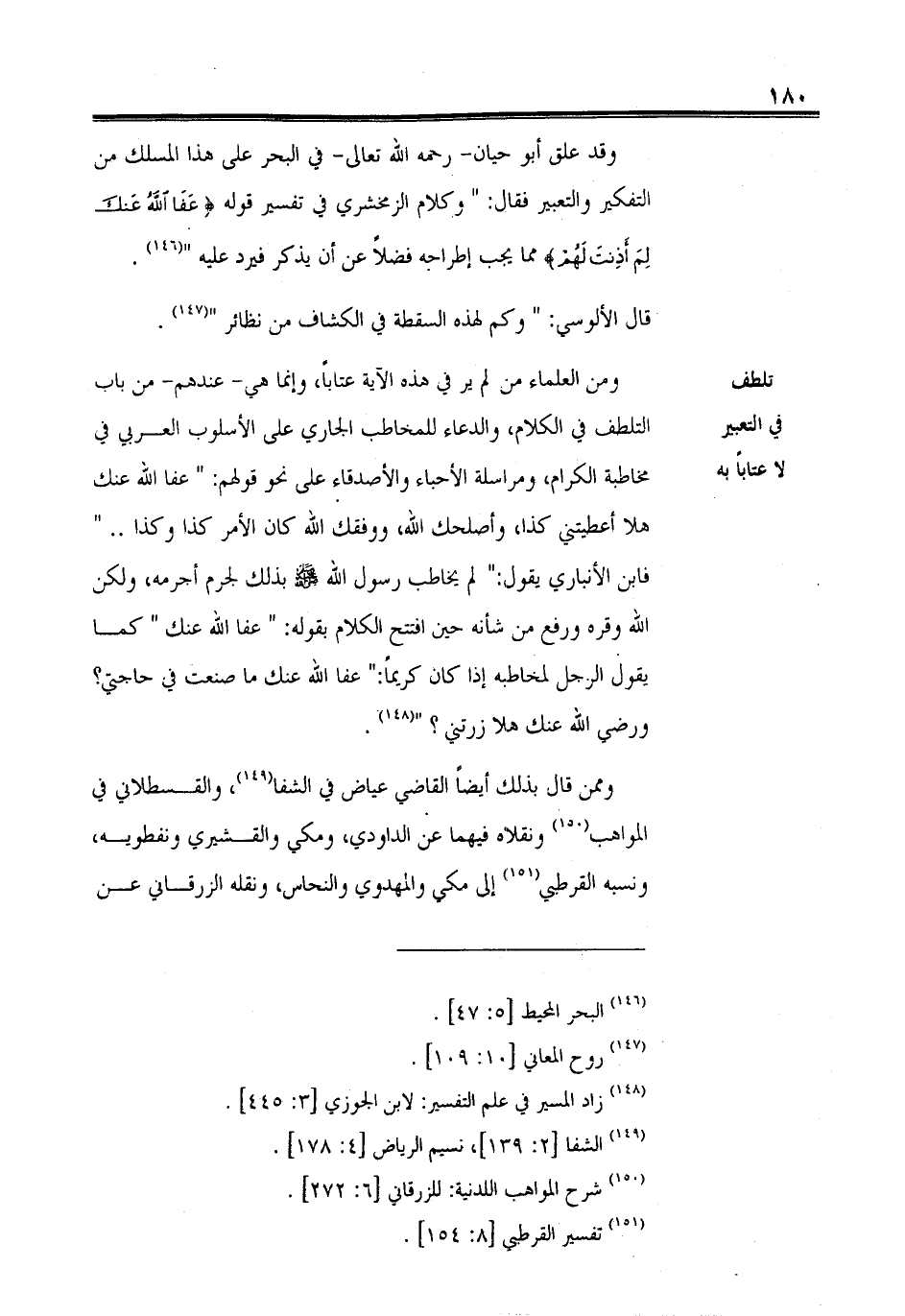 ومن العلماء من لم ير في هذه الآية عتاباً، وإنما هي -عندهم- من باب التلطف في الكلام، والدعاء للمخاطب الجاري على الأسلوب العربي في مخاطبة الكرام، ومراسلة الأحباء والأصدقاء على نحو قولهم: " عفا الله عنك هلا أعطيتني كذا، وأصلحك الله، ووفقك الله كان الأمر كذا وكذا. . " فابن الأنباري يقول: " لم يخاطب رسول الله - صلى الله عليه وسلم - بذلك لجرم أجرمه، ولكن الله وقره ورفع من شأنه حين افتتح الكلام بقوله: " عفا الله عنك " كما يقول الرجل لمخاطبه إذا كان كريماً: " عفا الله عنك ما صنعت في حاجتي؟ ورضي الله عنك هلا زرتني؟ ".