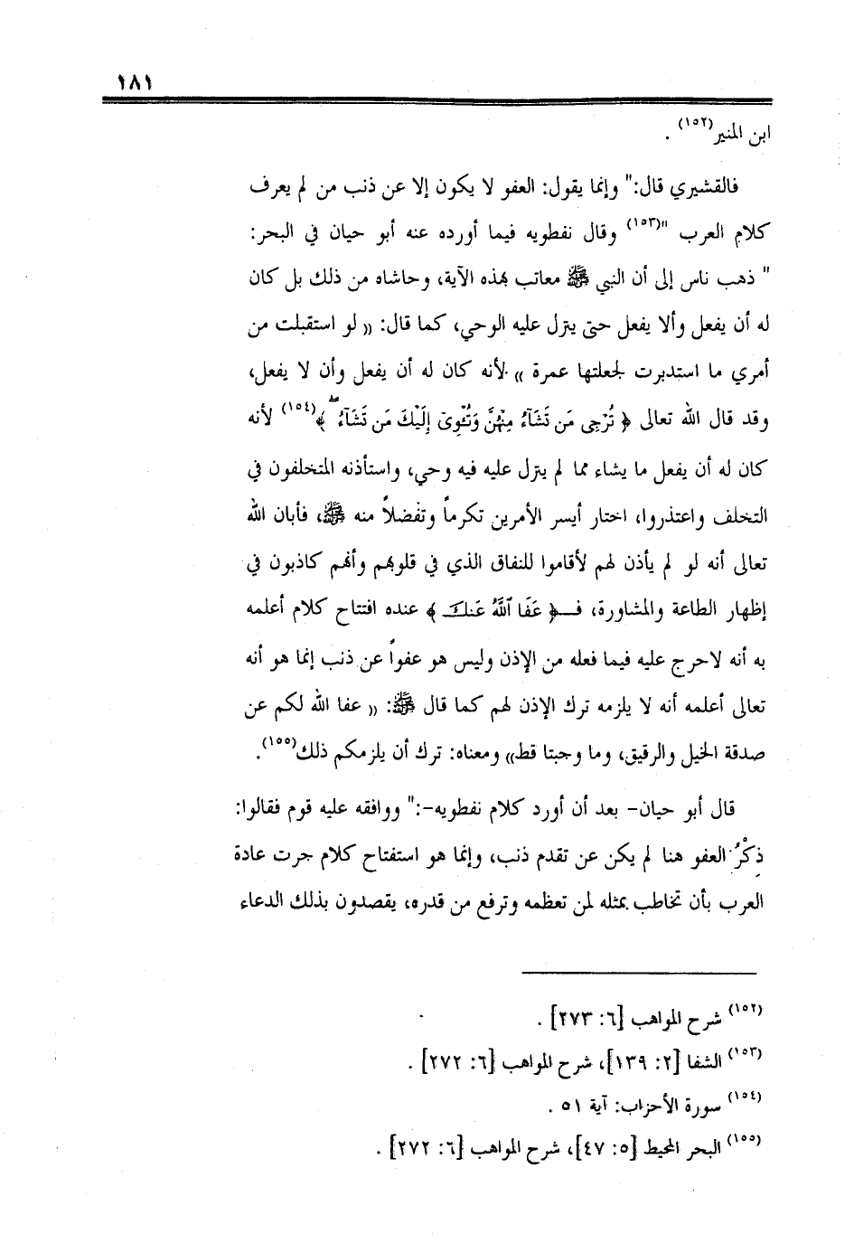 فالقشيري قال: " وإنما يقول: العفو لا يكون إلا عن ذنب من لم يعرف كلام العرب " وقال نفطويه فيما أورده عنه أبي حيان في البحر: " ذهب ناس إلى أن النبي - صلى الله عليه وسلم - معاتب بهذه الآية، وحاشاه من ذلك بل كان له أن يفعل وألا يفعل حتى ينزل عليه الوحي، كما قال: " لو استقبلت من أمري ما استدبرت لجعلتها عمرة ". لأنه كان له أن يفعل وأن لا يفعل، وقد قال الله تعالى (تُرْجِي مَنْ تَشَاءُ مِنْهُنَّ وَتُؤْوِي إِلَيْكَ مَنْ تَشَاءُ) لأنه كان له أن يفعل ما يشاء مما لم ينزل عليه فيه وحي، واستأذنه المتخلفون في التخلف واعتذروا، اختار أيسر الأمرين تكرماً وتفضلاً منه - صلى الله عليه وسلم -، فأبان الله تعالى أنه لو لم يأذن هم لأقاموا للنفاق الذي في قلوبهم وأنَّهم كاذبون في إظهار الطاعة والمشاورة، فـ (عَفَا اللهُ عَنْكَ) عنده افتتاح كلام أعلمه به أنه لا حرج عليه فيما فعله من الإذن وليس هو عفواً عن ذنب إنما هو أنه تعالى أعلمه أنه لا يلزمه ترك الإذن لهم كما قال - صلى الله عليه وسلم -: " عفا الله لكم عن صدقة الخيل والرقيق، وما وجبتا قط " ومعناه: ترك أن يلزمكم ذلك.