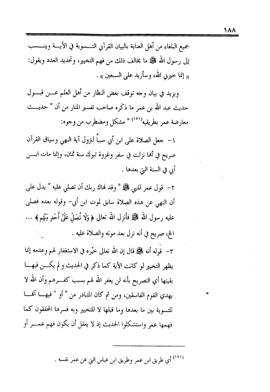 3 - قوله أنه - صلى الله عليه وسلم - قال إن الله تعالى خيّره في الاستغفار لهم وعدمه إنما يظهر التخيير لو كانت الآية كما ذكر في الحديث ولم يكن فيها بقيتها أي التصريح بأنه لن يغفر الله لهم بسبب كفرهم وأن الله لا يهدي القوم الفاسقين، ومن ثم كان المتبادر من " أو " فيها أنها للتسوية بين ما بعدها وما قبلها لا للتخيير وبه فسرها المحققون كما فهمها عمر واستشكلوا الحديث إذ لا يعقل أن يكون فهم عمر أو
