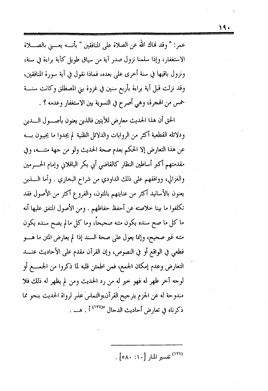 الحق أن هذا الحديث معارض للآيتين فالذين يعنون بأصول الدين ودلائله القطعية أكثر من الروايات والدلائل الظنية لم يجدوا ما يجيبون به عن هذا التعارض إلا الحكم بعدم صحة الحديث ولو من جهة متنه، وفي مقدمتهم أكبر أساطين النظار كالقاضي أبي بكر الباقلاني وإمام الحرمين والغزالي، ووافقهم على ذلك الداودي من شراح البخاري. وأما الذين يعنون بالأسانيد أكثر من عنايتهم بالمتون، والفروع أكثر من الأصول فقد تكلفوا ما بينا خلاصته عن أحفظ حفاظهم. ومن الأصول المتفق عليها أنه ما كل ما صح سنده يكون متنه صحيحاً، وما كل ما لم يصح سنده يكون متنه غير صحيح، وإنما يعول على صحة السند إذا لم يعارض المتن ما هو قطعي في الواقع أو في النصوص، وإن القرآن مقدم على الأحاديث عند التعارض وعدم إمكان الجمع، فمن اطمئن قلبه لما ذكررا من الجمع أو لوجه آخر ظهر له فهو خير له من رد الحديث ومن لم يظهر له ذلك فلا مندوحة له عن الجزم بترجيح القرآن، والتماس عذر لرواة الحديث بنحو مما ذكرناه في تعارض أحاديث الدجال ". أ. هـ