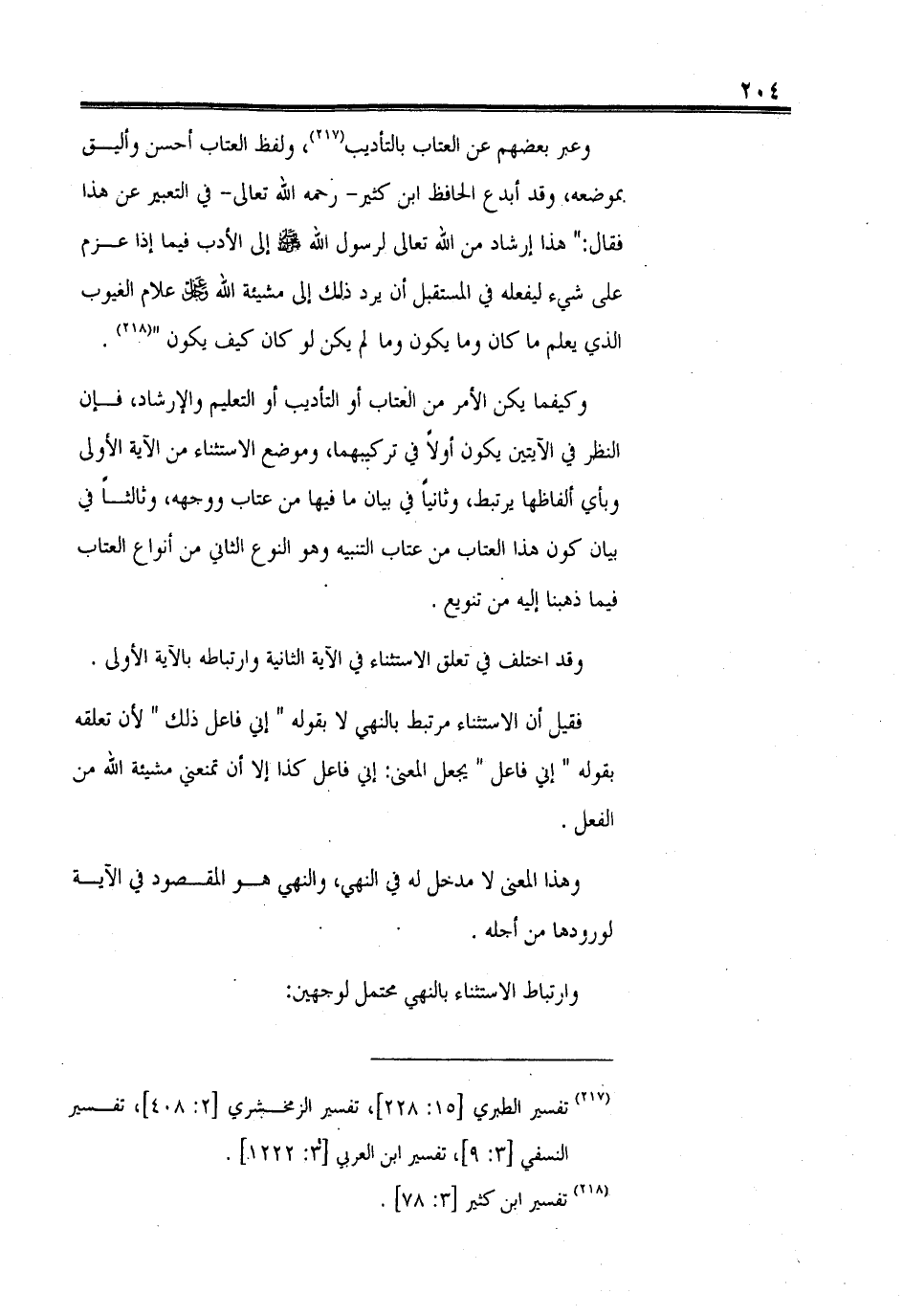 فقيل إن الاستثناء مرتبط بالنهي لا بقوله " إني فاعل ذلك " لأن تعلقه بقوله " إني فاعل " يجعل المعنى: إني فاعل كذا إلا أن تمنعني مشيئة الله من الفعل.