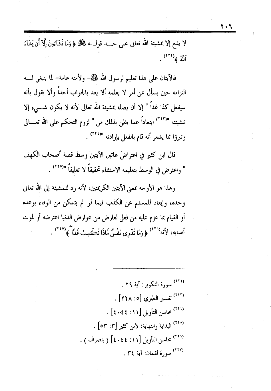 وهذا هو الأوجه بمعنى الآيتين الكريمتين، لأنه رد للمشيئة إلى الله تعالى وحده، وإبعاد للمسلم عن الكذب فيما لو لم يتمكن من الوفاء بوعده أو القيام بما عزم عليه من فعل لعارض من عوارض الدنيا اعترضه أو لموت أصابه، لأنه (وَمَا تَدْرِي نَفْسٌ مَاذَا تَكْسِبُ غَدًا).
