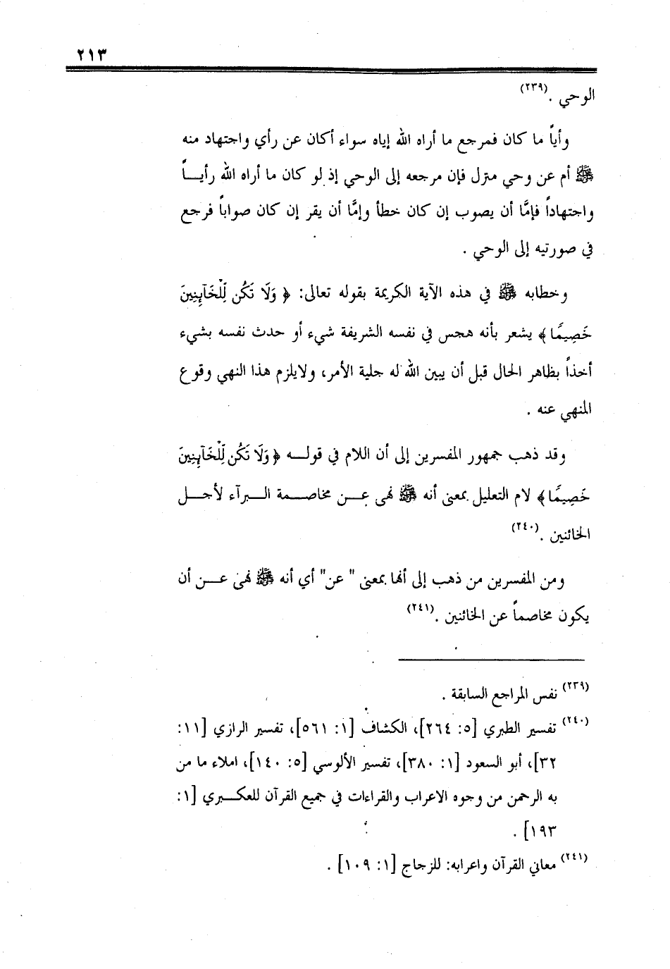 وقد ذهب جمهور المفسرين إلى أن اللام في قوله (وَلَا تَكُنْ لِلْخَائِنِينَ خَصِيمًا) لام التعليل بمعنى أنه - صلى الله عليه وسلم - نهي عن مخاصمة البرآء لأجل الخائنين.