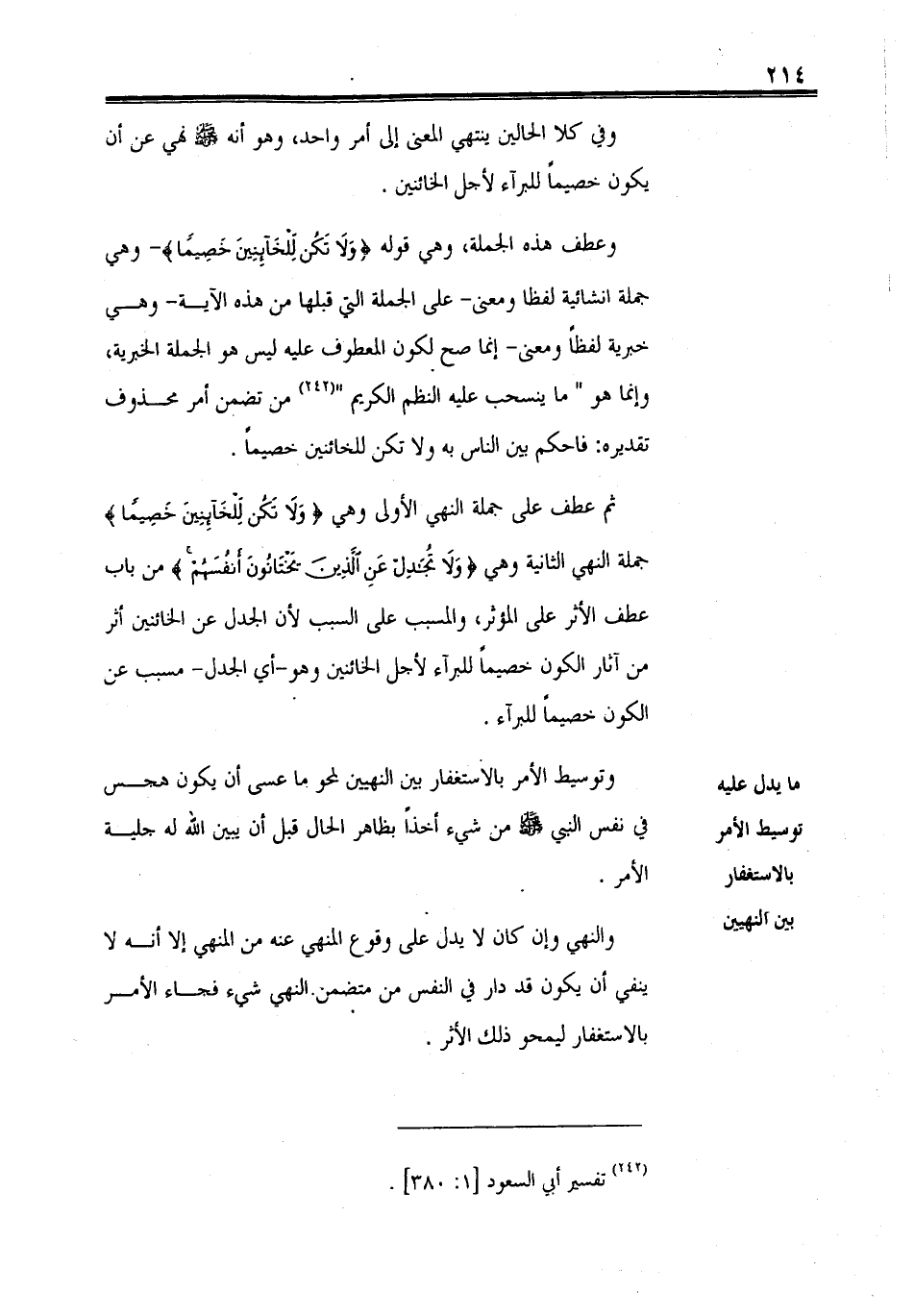 وتوسيط الأمر بالاستغفار بين النهيين لمحو بها عسى أن يكون هجس في نفس النبي - صلى الله عليه وسلم - من شيء أخذاً بظاهر الحال قبل أن يبين الله له جلية الأمر.